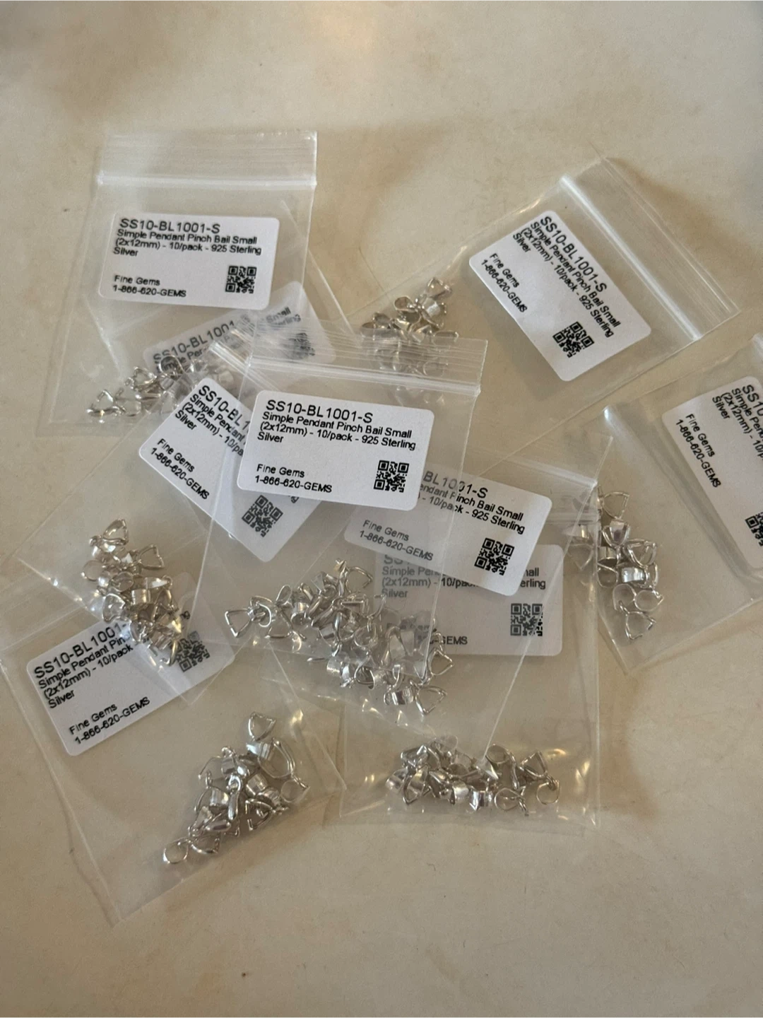 I have several packs of Simple Pendant Pinch Bail Small (2x12mm) - 10/pack - .925 Sterling Silver. Great for jewelry making. One or two packs may miss 1-2 bails. Can check upon pick up.