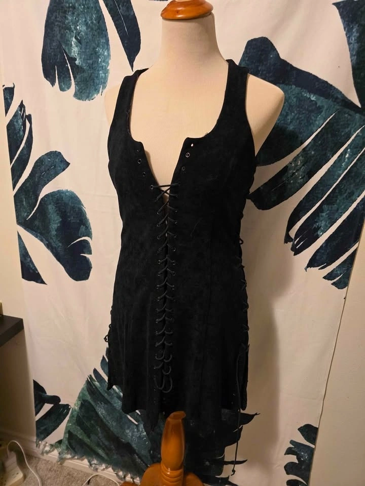 This dress is suede with cut-outs on the side that can be folded closed, similar to the front. The size tag says small, but it fits more like a medium and has some stretch.