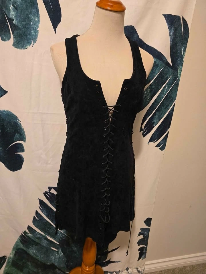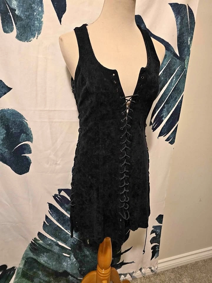 This dress is suede with cut-outs on the side that can be folded closed, similar to the front. The size tag says small, but it fits more like a medium and has some stretch.