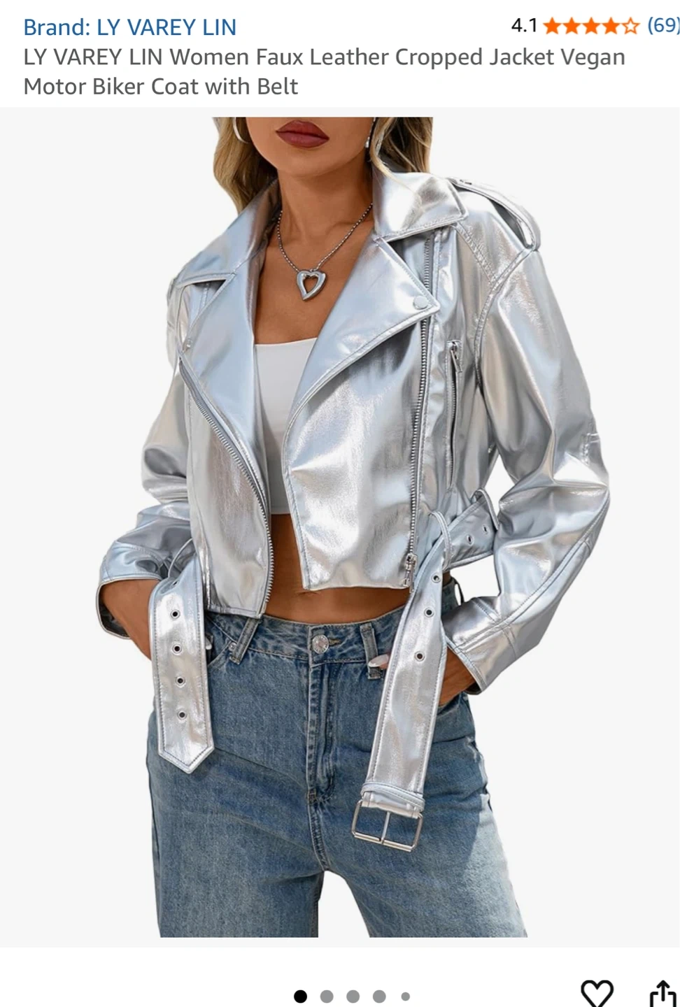 This LY VAREY LIN cropped biker jacket is made from silver faux leather. It features a turn-down collar, slide zippers, and a detachable belt. It's a stylish outerwear piece for a bold look!