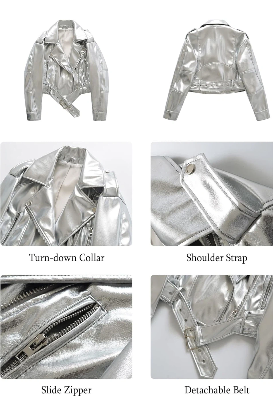 This LY VAREY LIN cropped biker jacket is made from silver faux leather. It features a turn-down collar, slide zippers, and a detachable belt. It's a stylish outerwear piece for a bold look!