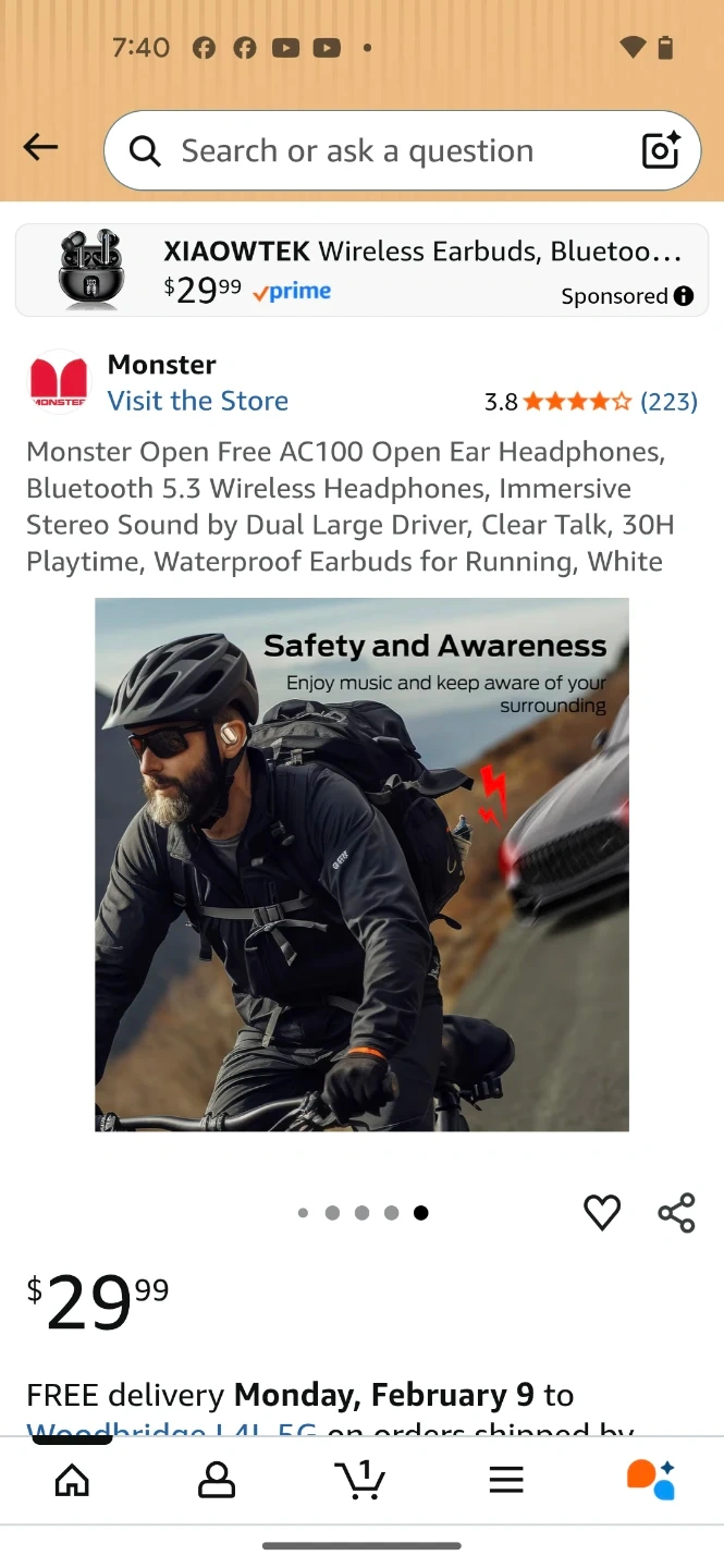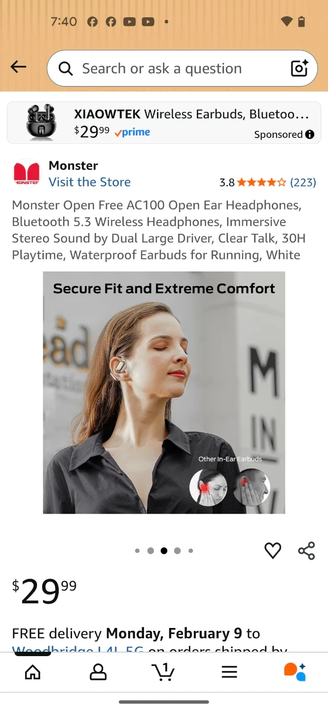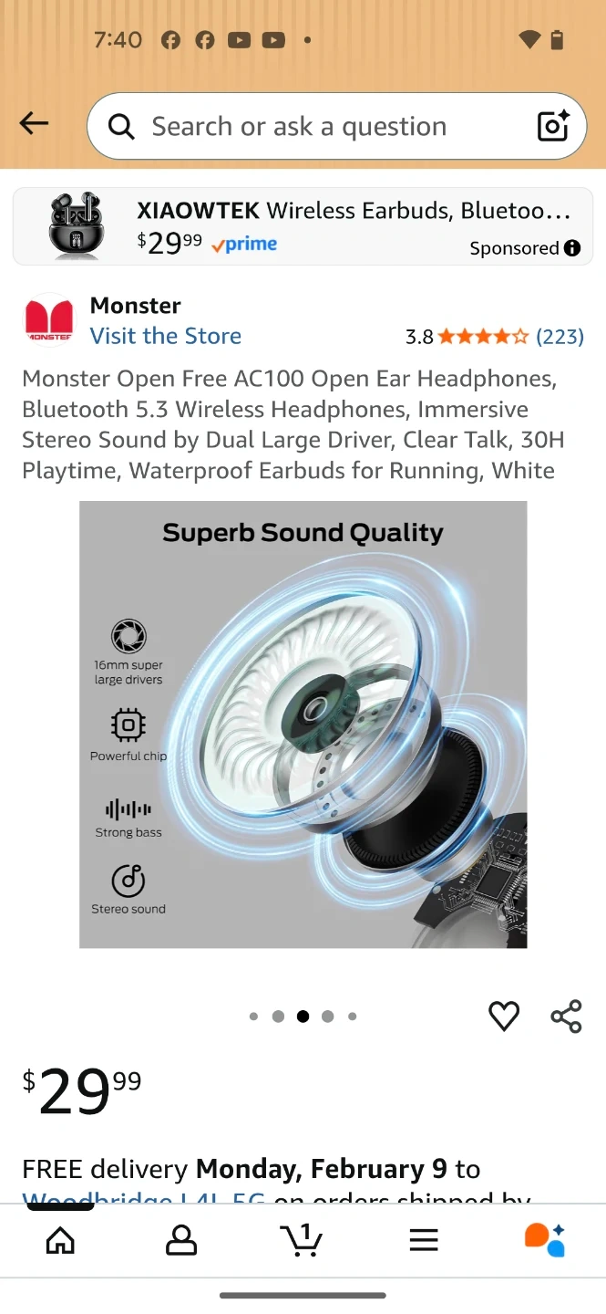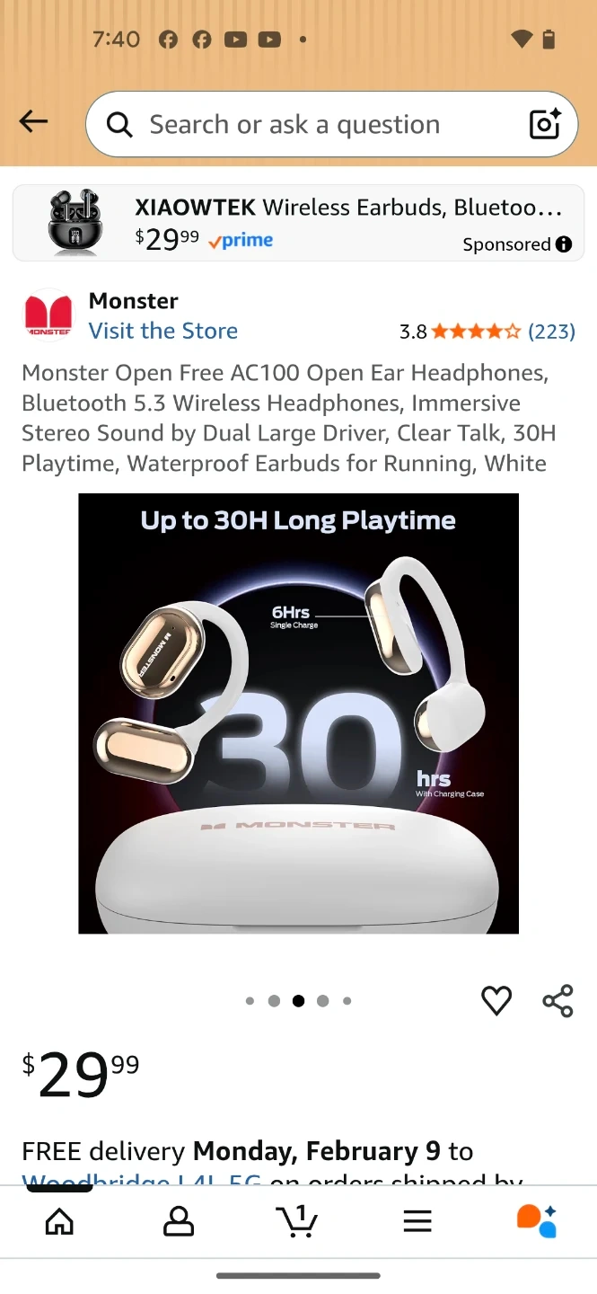 Monster Open Free AC100 wireless earbuds in white. These Bluetooth 5.3 headphones offer 30H playtime with the charging case and have an open-ear design for comfort. They feature dual large drivers for immersive stereo sound and clear talk capabilities.