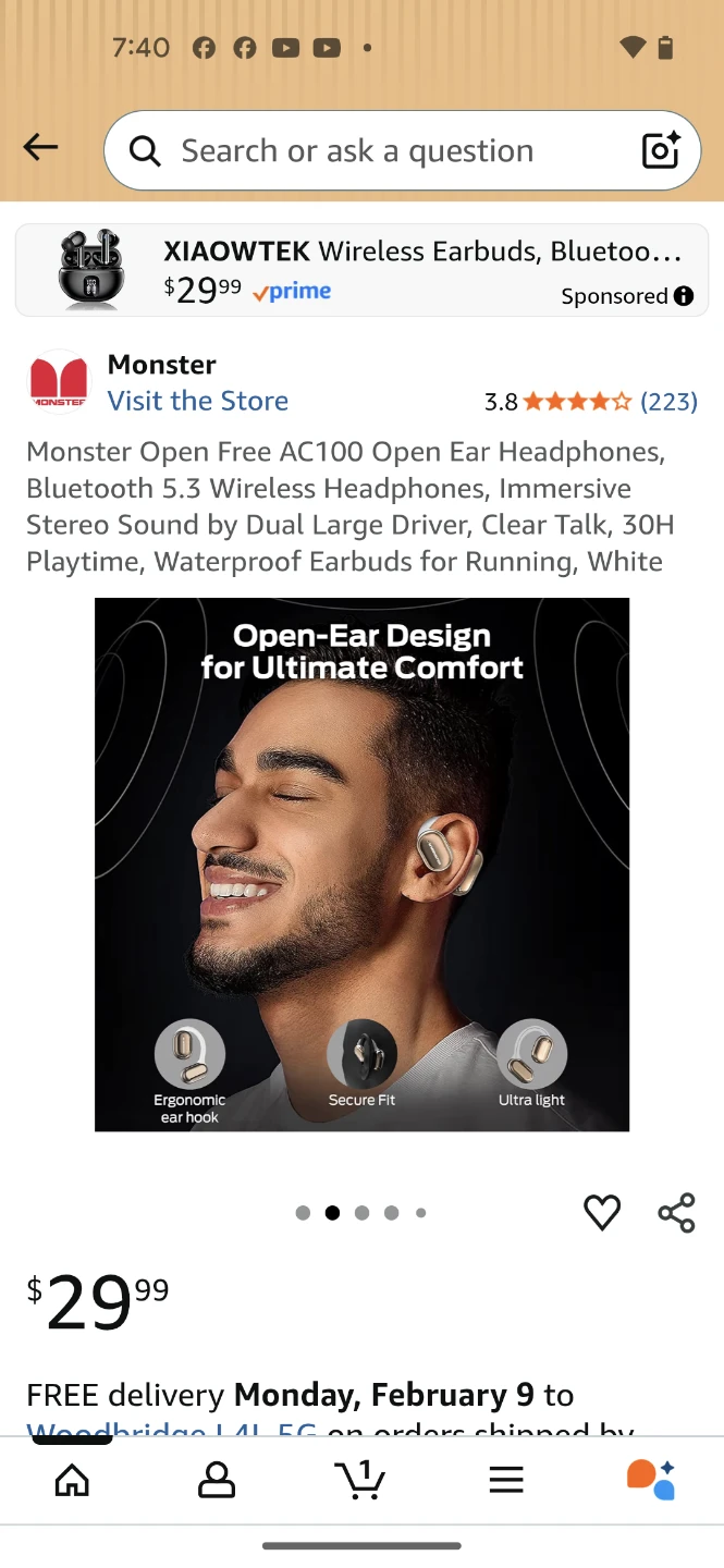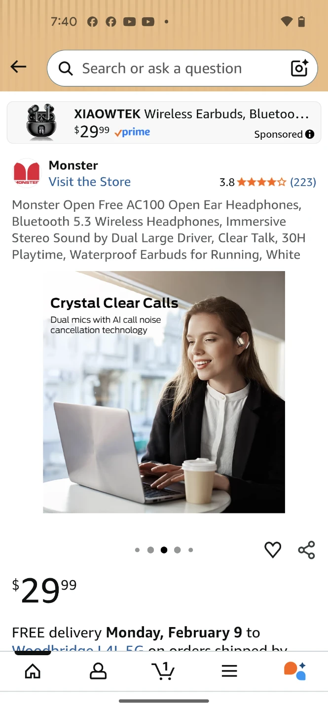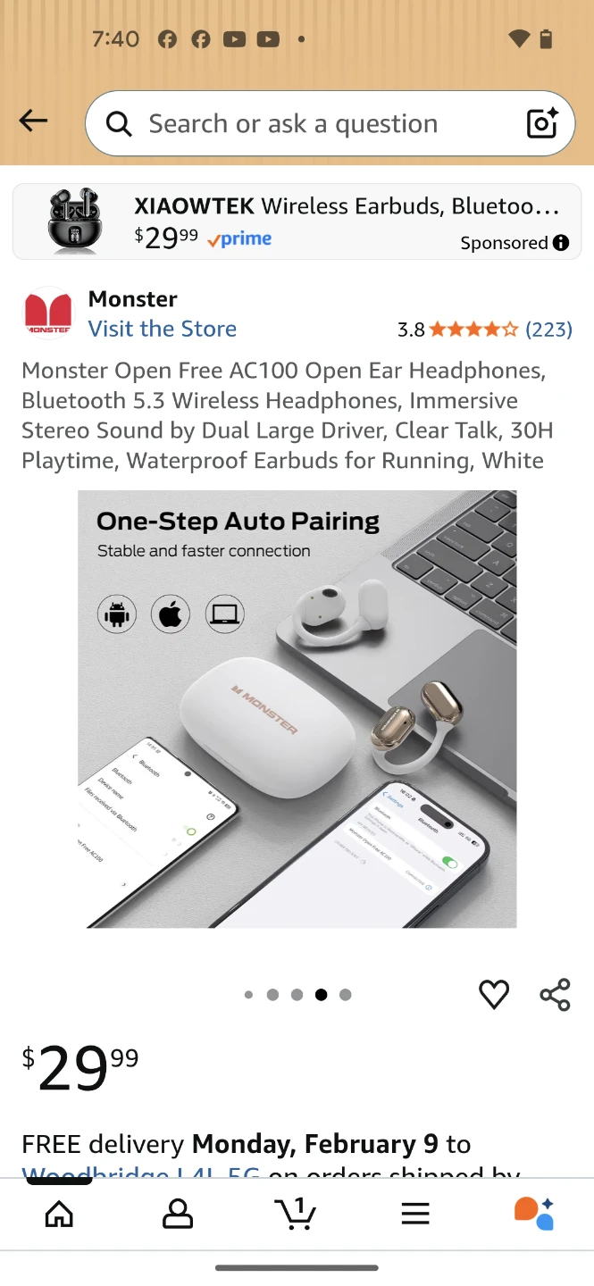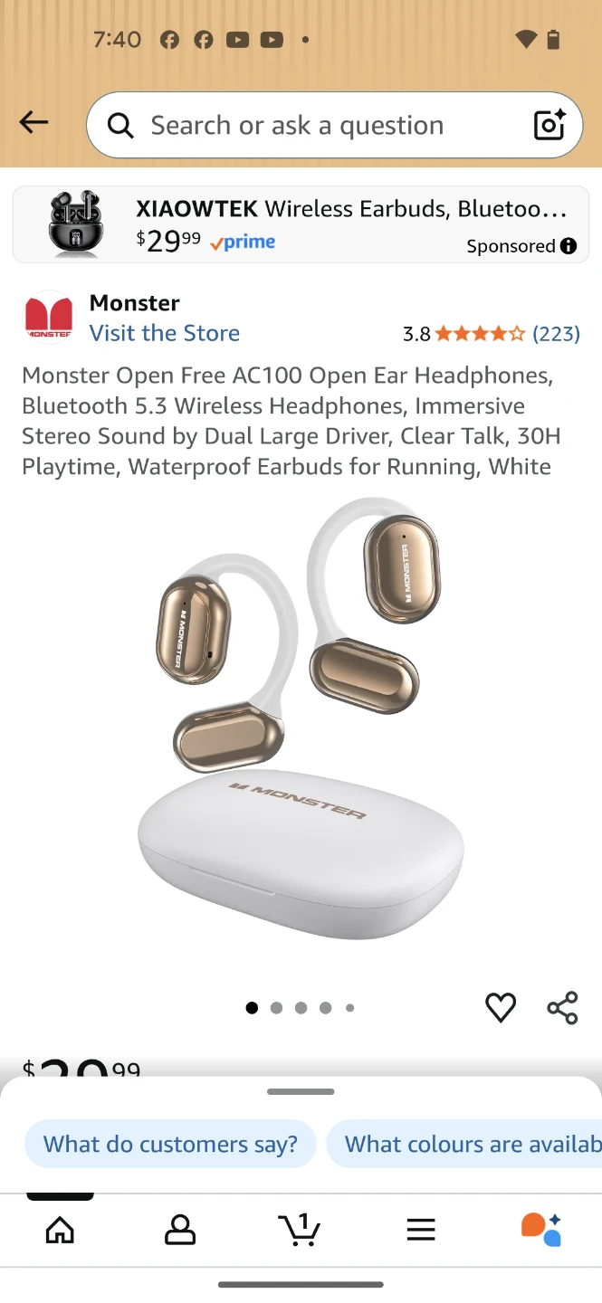 Monster Open Free AC100 wireless earbuds in white. These Bluetooth 5.3 headphones offer 30H playtime with the charging case and have an open-ear design for comfort. They feature dual large drivers for immersive stereo sound and clear talk capabilities.