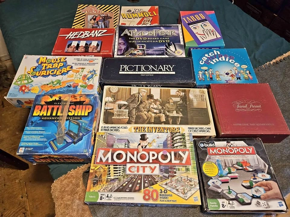 Large bundle of board games – great for family nights or resale. Includes: Monopoly City + Monopoly U-Build, Electronic Battleship, Mouse Trap, Pictionary (First Edition), Atmosfear DVD Game, Hedbanz, Taboo, Catch Phrase, Rummoli, The Inventors, Trivial Pursuit, Home Improvement game. Good variety of classic and fun games. Condition varies – most appear complete but not checked piece-by-piece. Selling as one lot only. Pickup in Enderby.