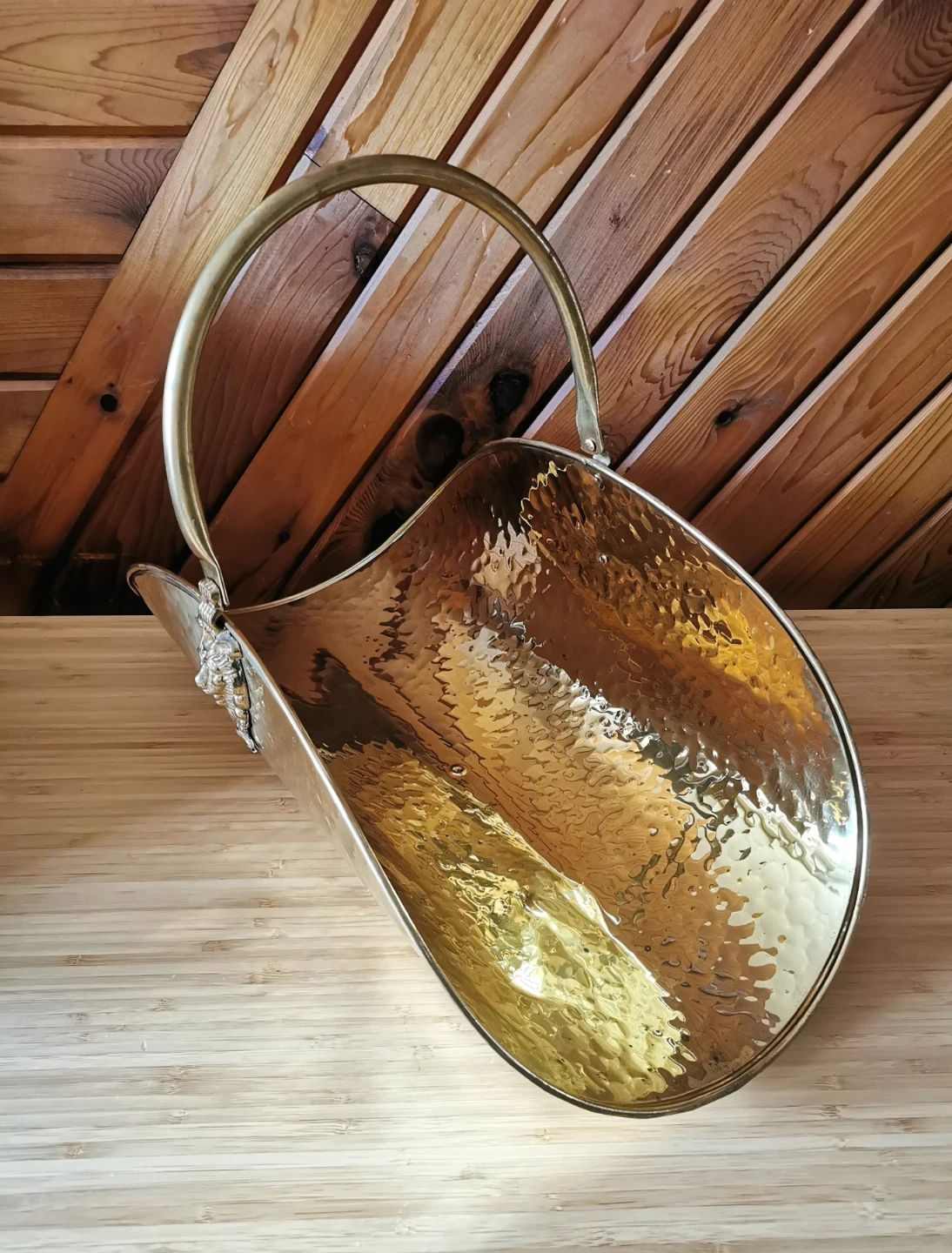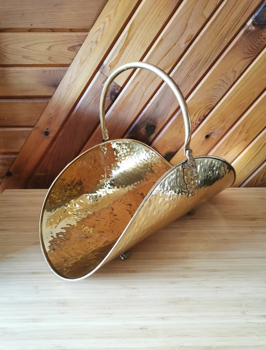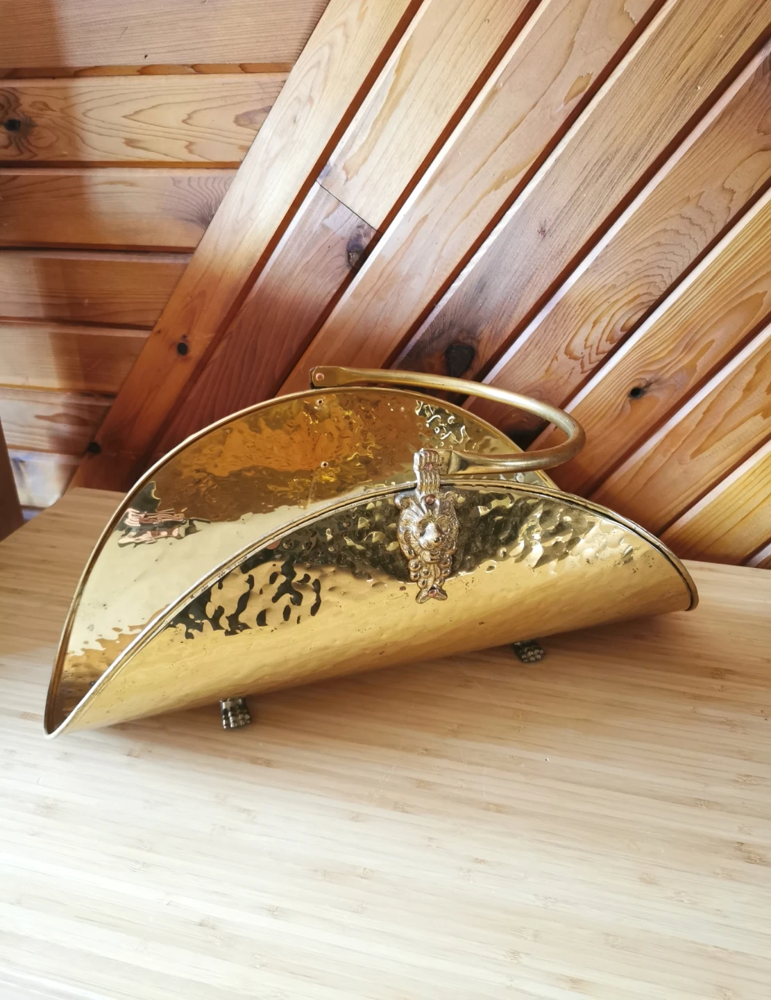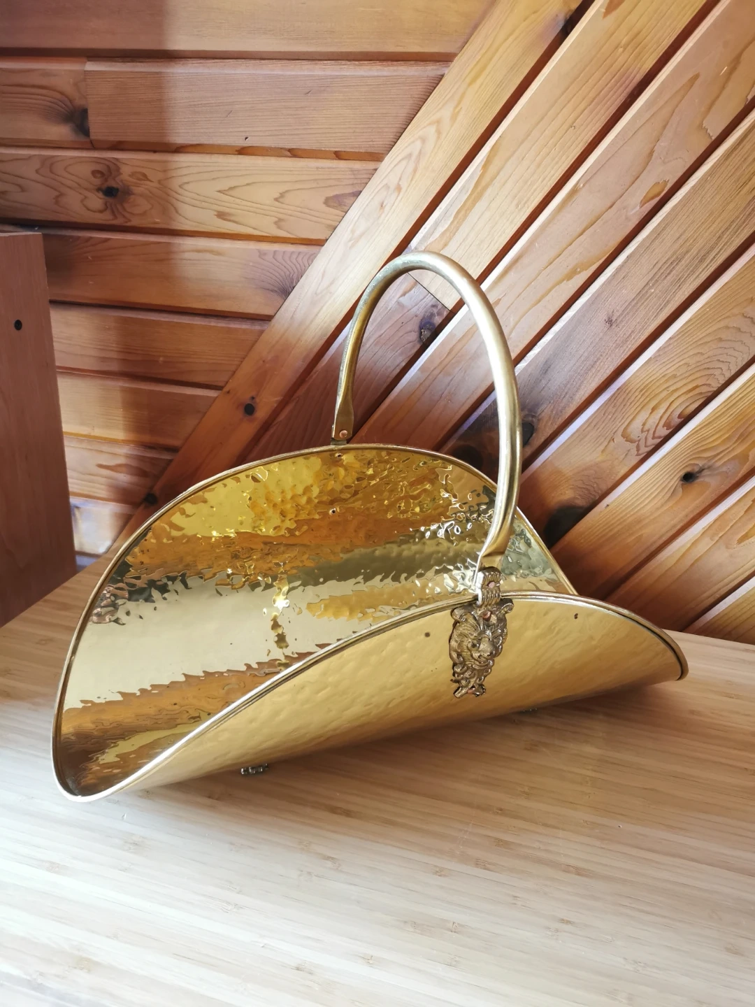 Beautiful vintage Moroccan decorative log holder that can also be used as a stylish magazine rack. Features a hammered brass-finish metal body with ornate cast lion head detail and lion feet, along with a curved carry handle that adds a classic old-world look.