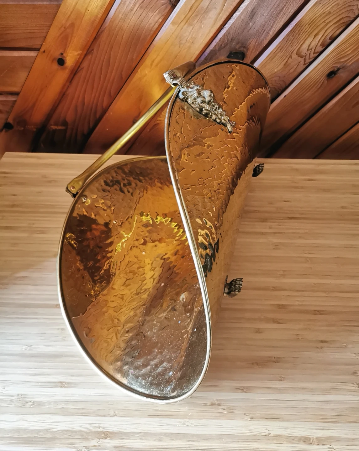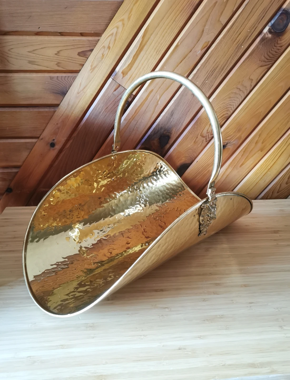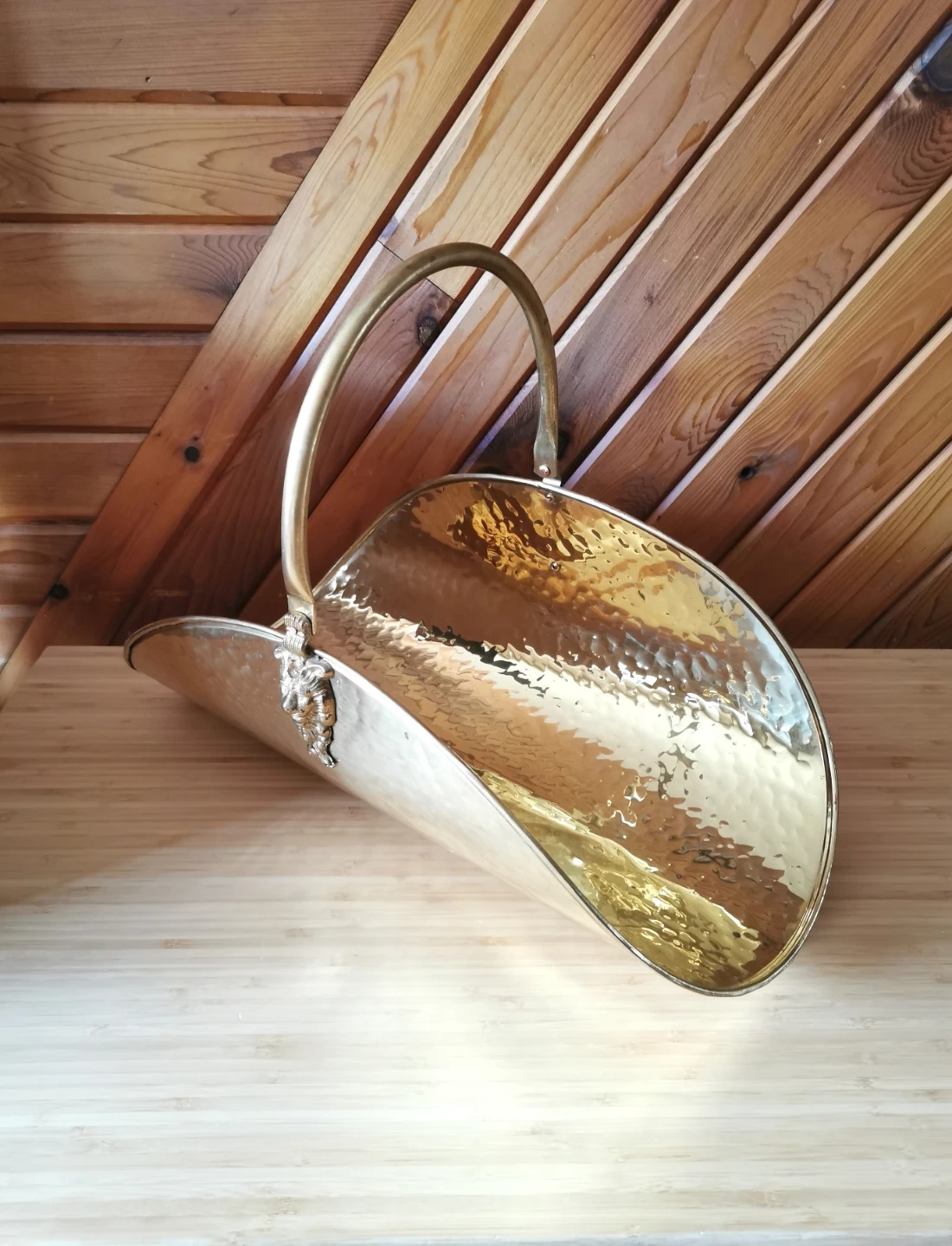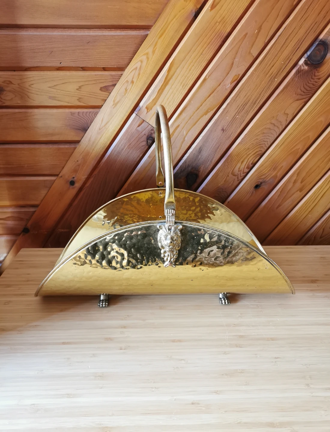 Beautiful vintage Moroccan decorative log holder that can also be used as a stylish magazine rack. Features a hammered brass-finish metal body with ornate cast lion head detail and lion feet, along with a curved carry handle that adds a classic old-world look.