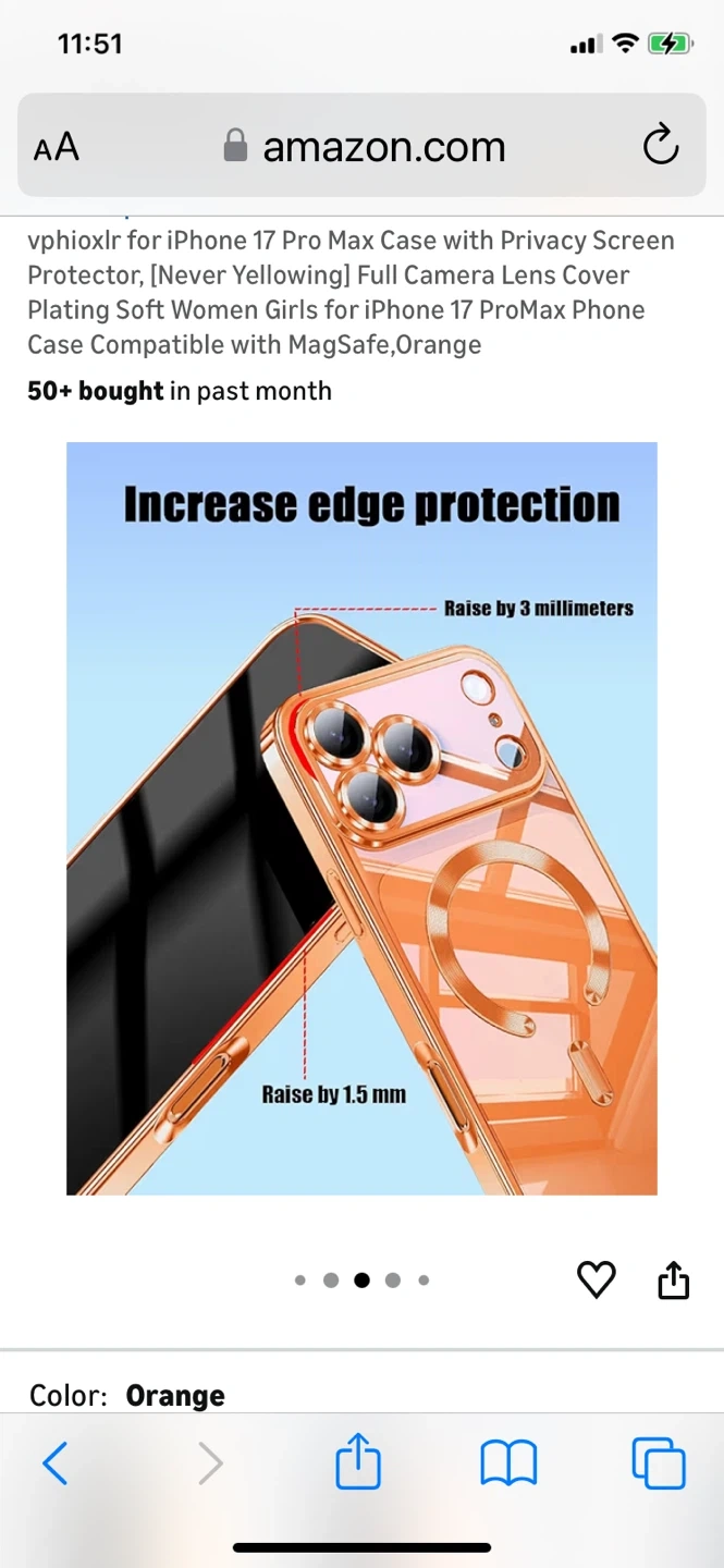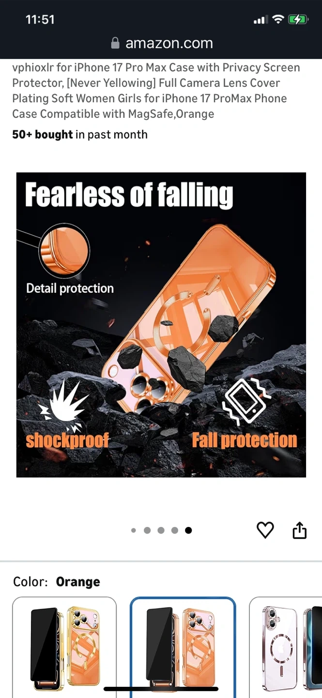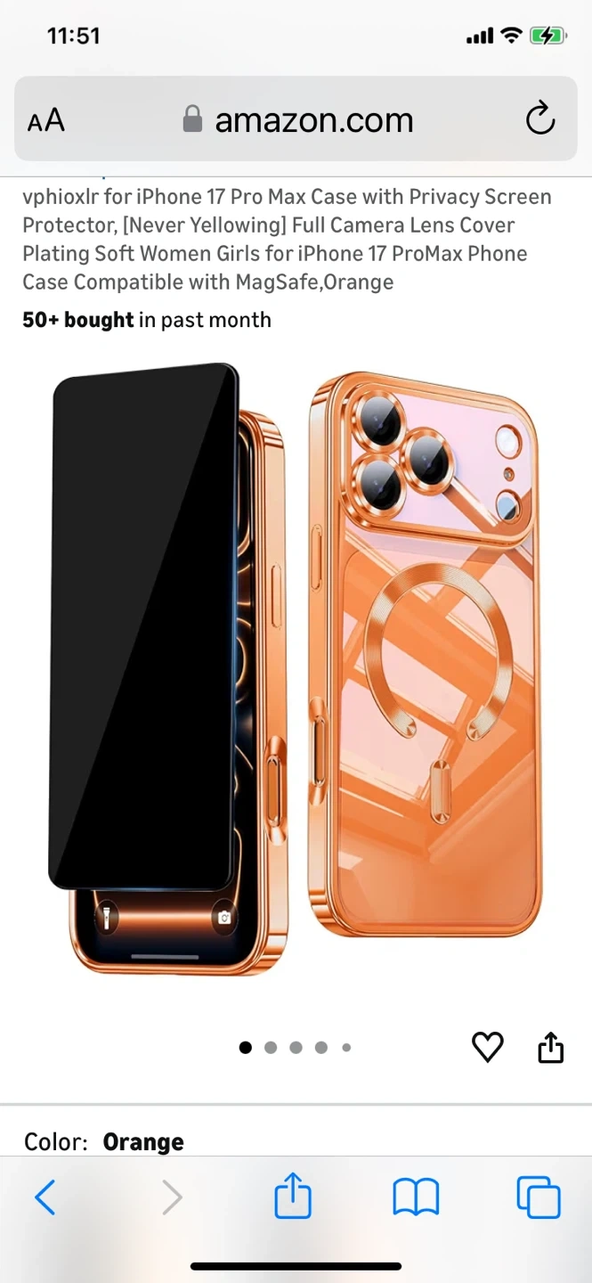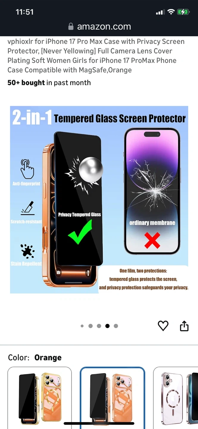 orange vphioxlr phone case for the iPhone 17 Pro Max. It features a full camera lens cover and is compatible with MagSafe. It also has a privacy screen protector and is designed to be scratch-resistant and stain-repellent
