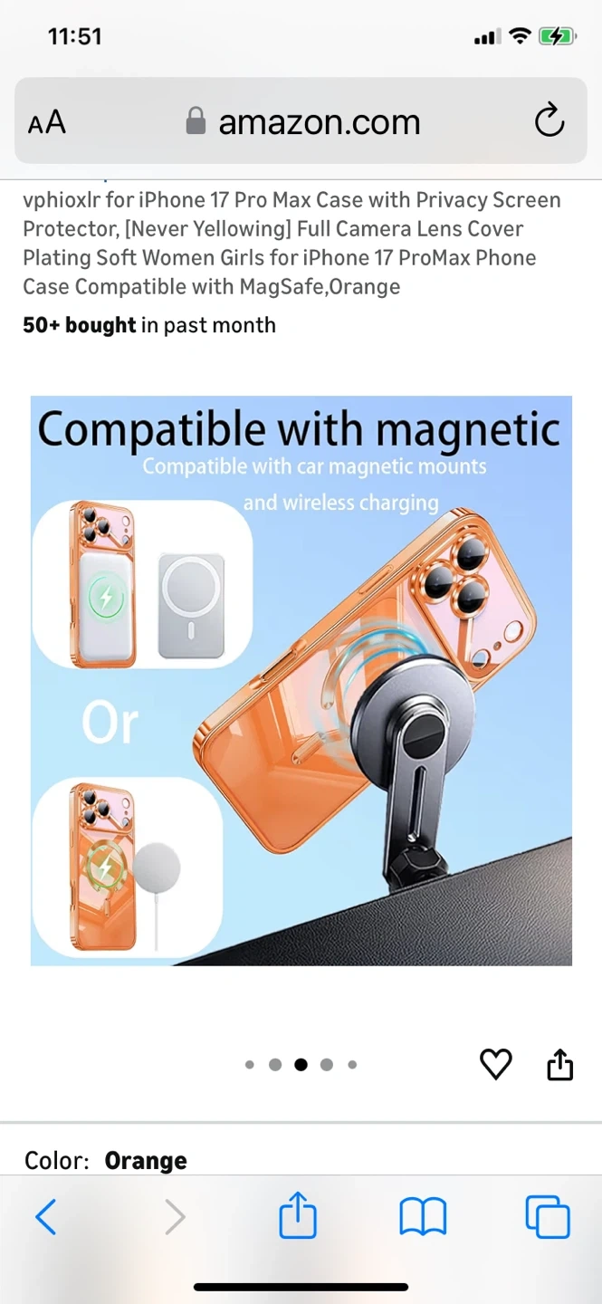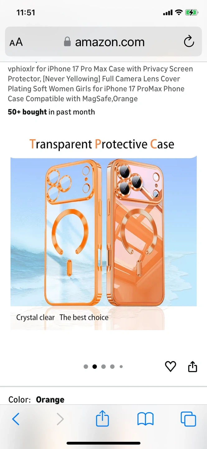 orange vphioxlr phone case for the iPhone 17 Pro Max. It features a full camera lens cover and is compatible with MagSafe. It also has a privacy screen protector and is designed to be scratch-resistant and stain-repellent