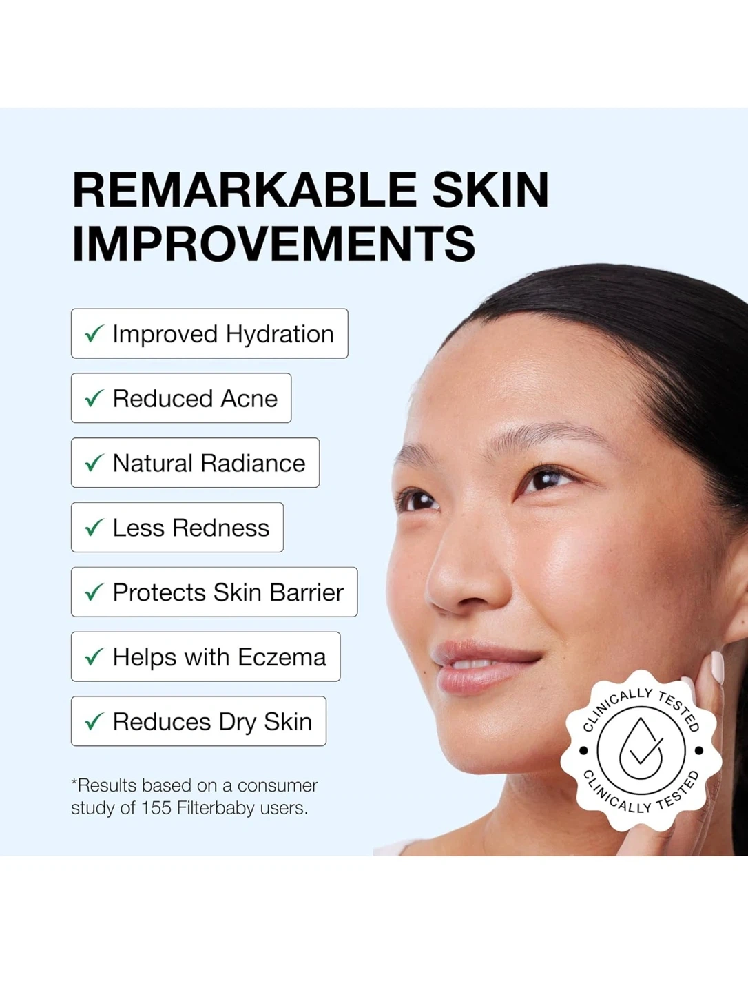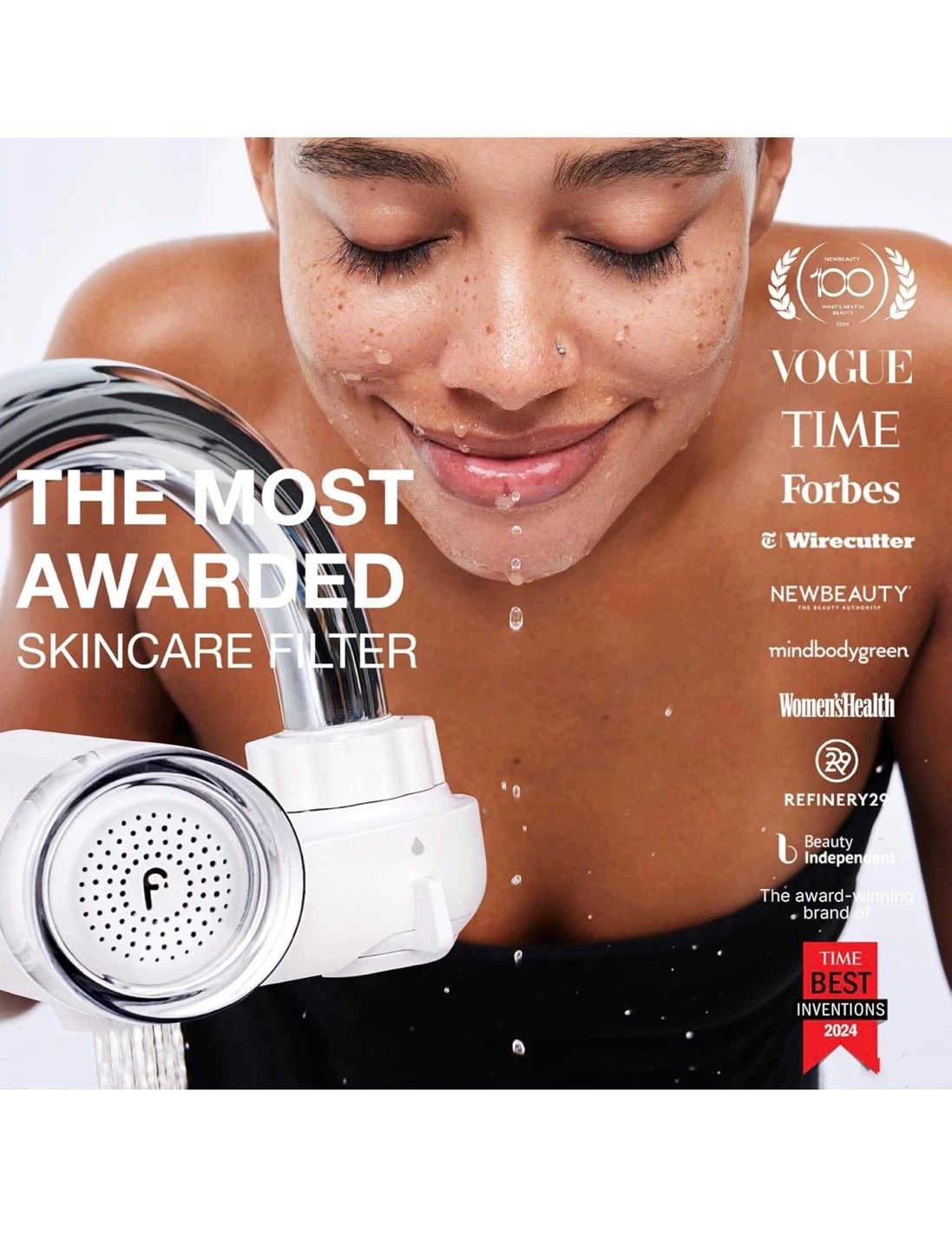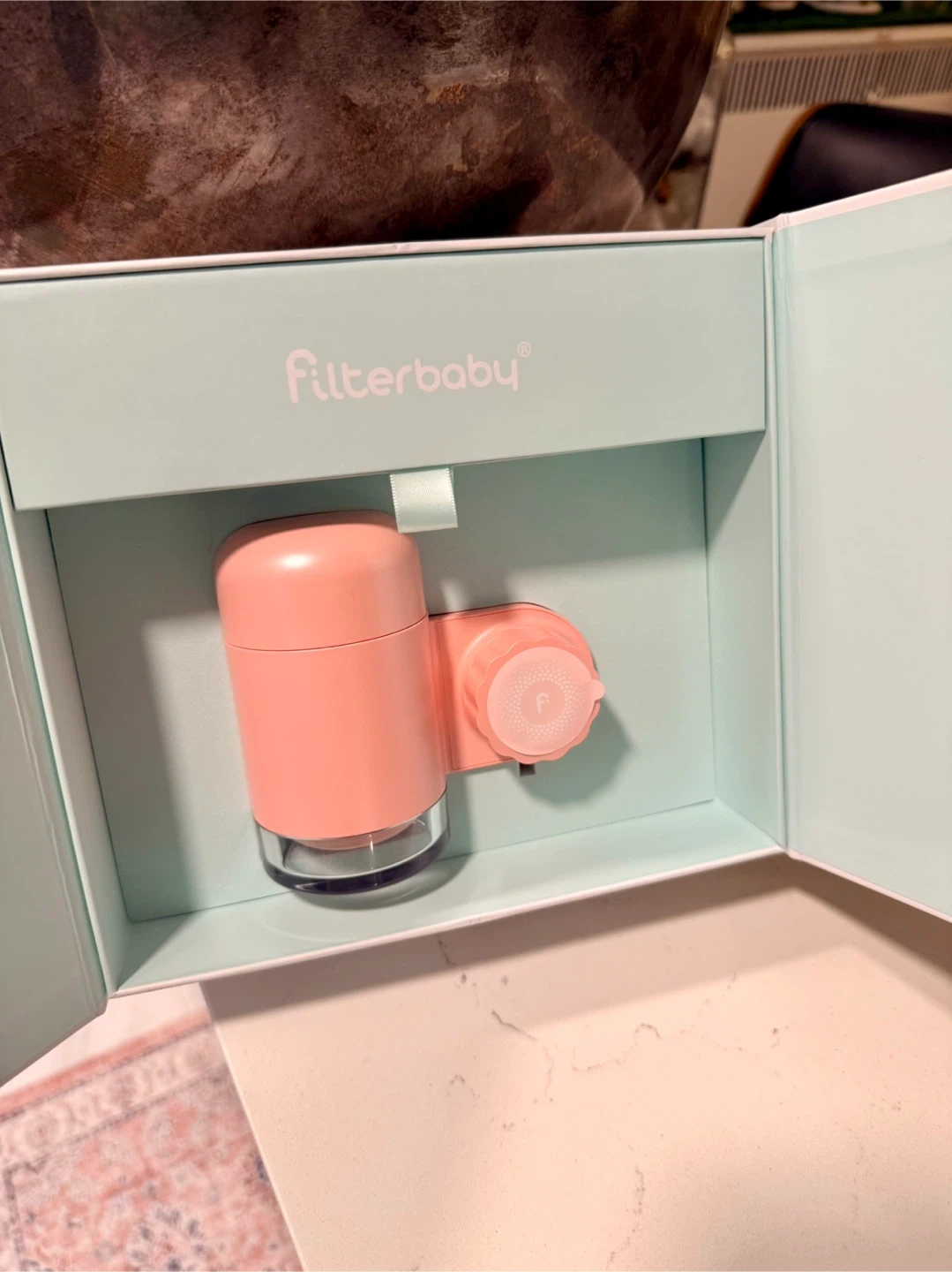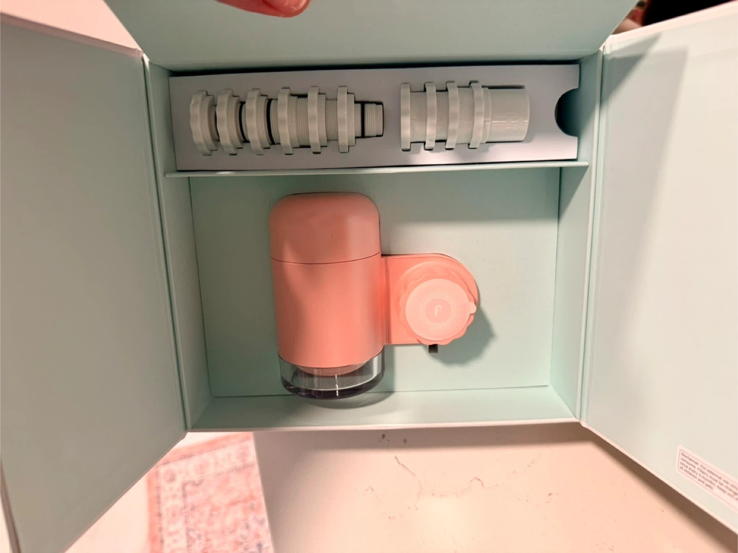 This is a Filterbaby skincare water filter in a lovely pink color. It's designed to improve hydration, reduce acne, and help with dry skin. The device comes in its original packaging with all components included.