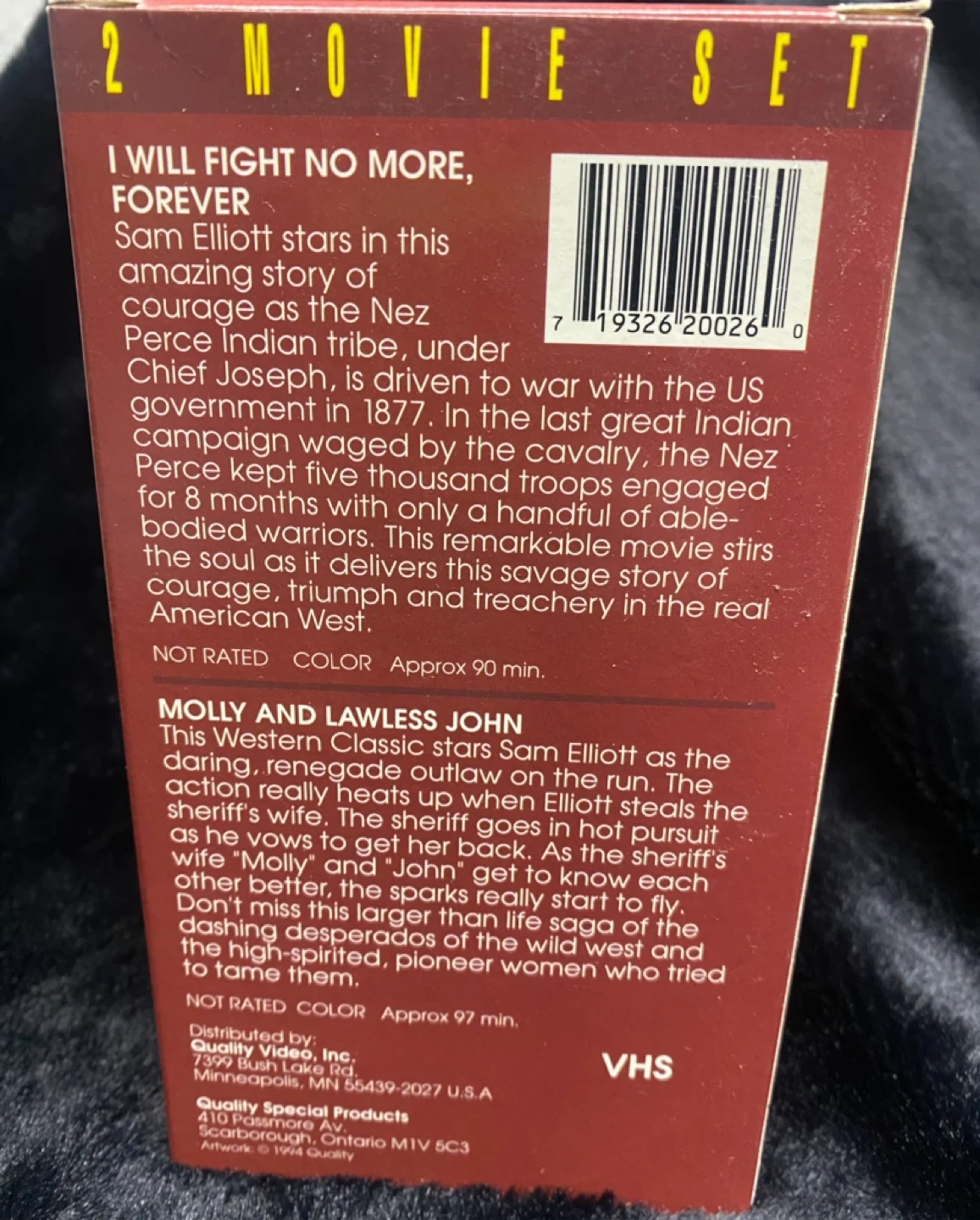 This Quality Video set includes two Sam Elliott movies: 'I Will Fight No More, Forever' and 'Molly and Lawless John'. 'I Will Fight No More, Forever' is approximately 90 minutes and 'Molly and Lawless John' is approximately 97 minutes. It's a great collection for fans of Westerns!
