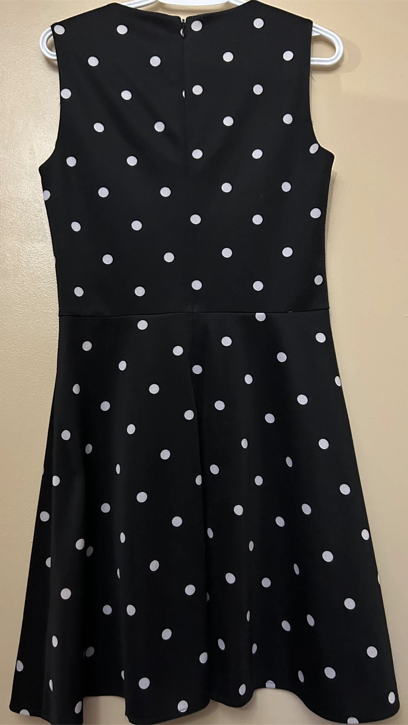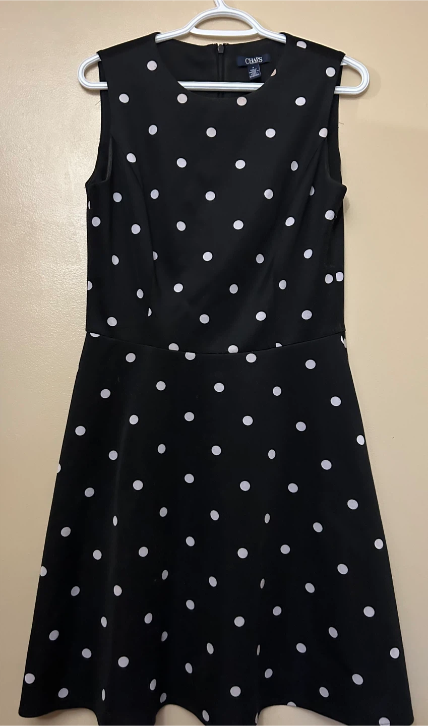 This is a lovely Chaps polka dot dress, perfect for any occasion! It's in good condition, ready for a new home. The dress features a classic black and white polka dot pattern, a sleeveless design, and a flattering A-line silhouette. I've priced it competitively, so it's ready to twirl its way into your wardrobe! Don't wait, dresses like this don't stay available for long. If the ad is up, it's still available!