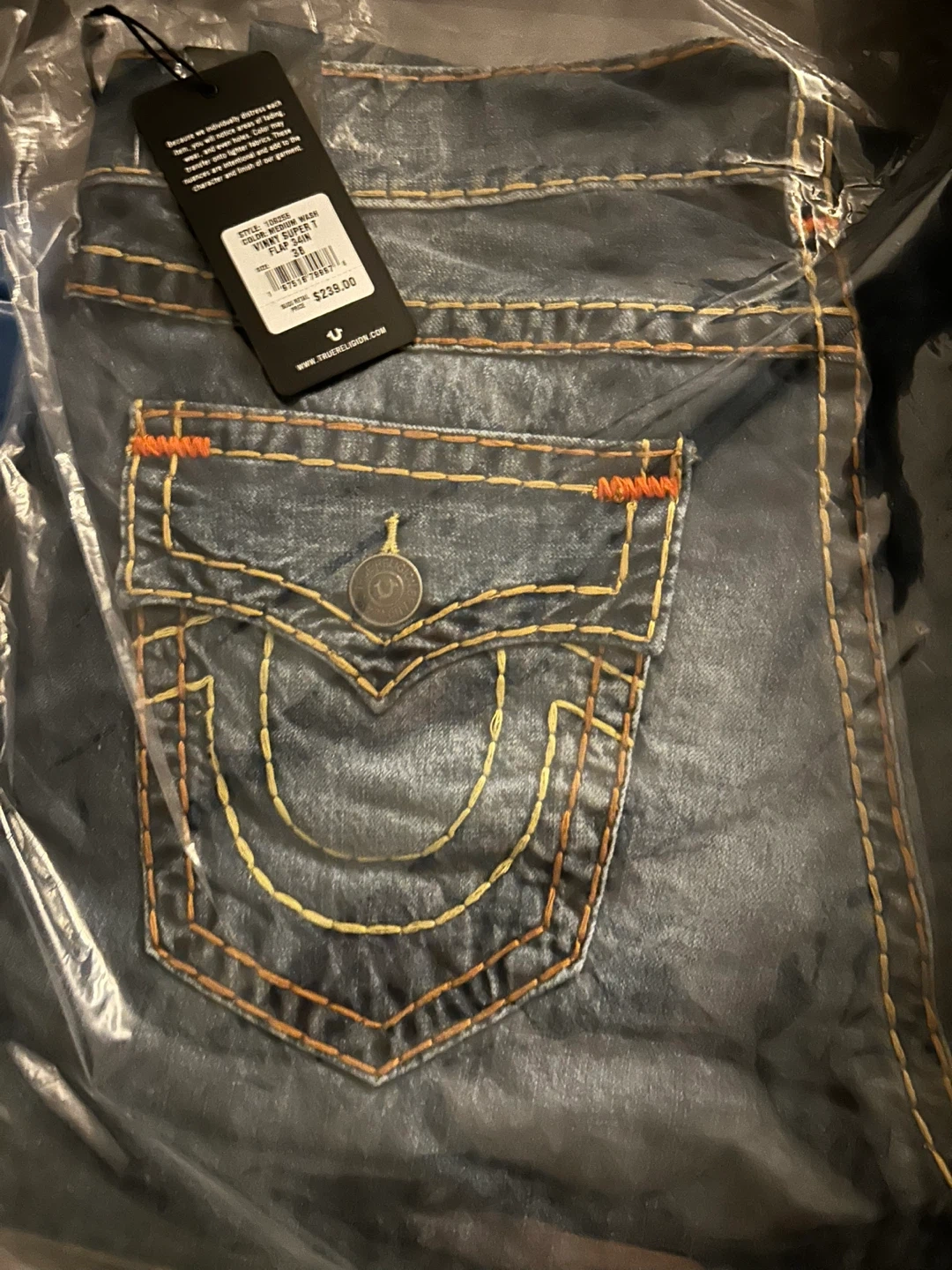 These are True Religion men's Vinny Super T jeans in a medium wash. They're a size 38 with flap pockets. The denim has intentional distressing and unique stitching details.
