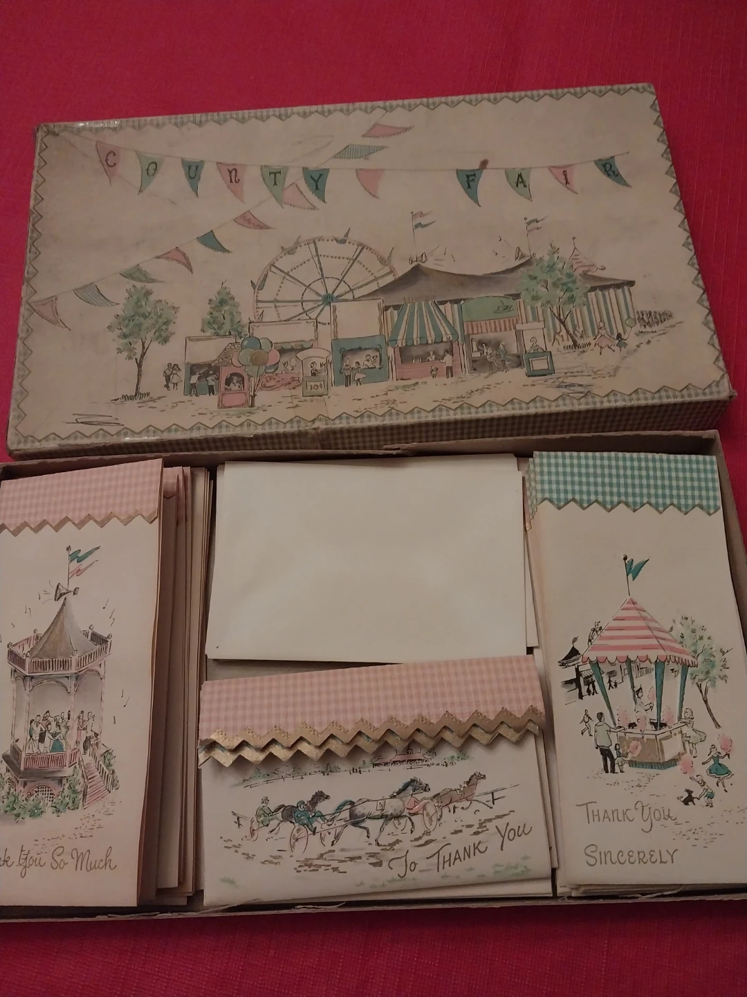 A collection of vintage thank you cards featuring charming illustrations. Each card is adorned with decorative trim and comes with matching envelopes. The set is presented in a decorative box, ready for use.