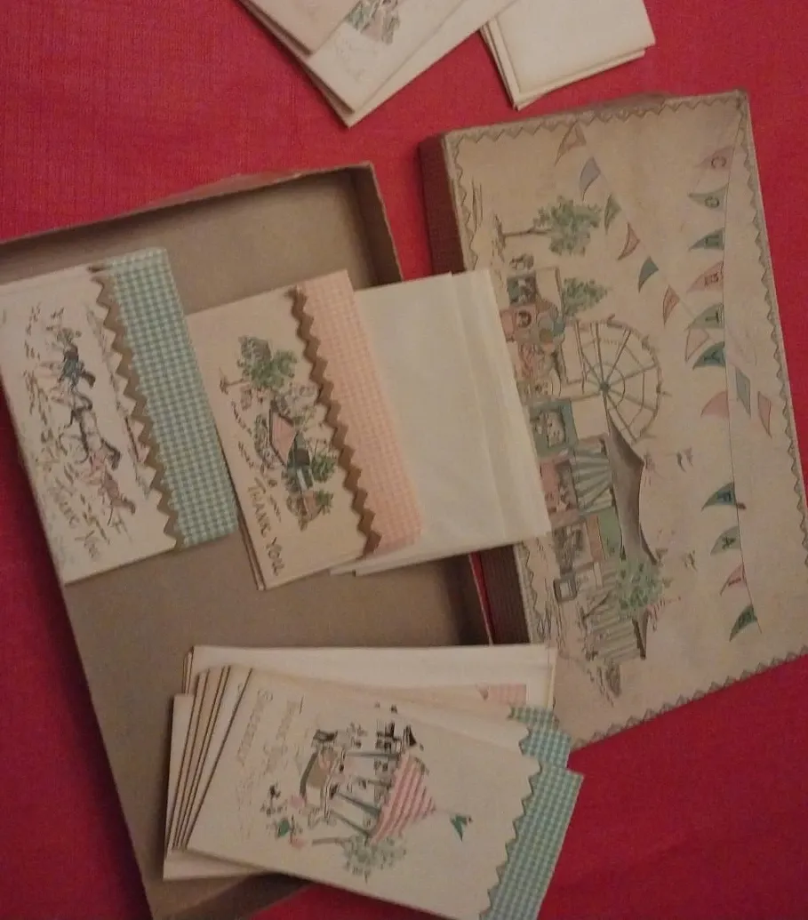 A collection of vintage thank you cards featuring charming illustrations. Each card is adorned with decorative trim and comes with matching envelopes. The set is presented in a decorative box, ready for use.