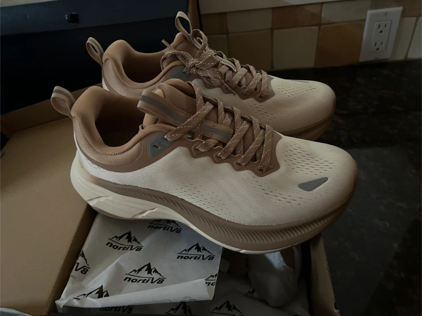 New!!These NORTIV8 running shoes are in a beige and khaki colourway. The shoes are US size 10, EUR size 41.5, UK size 8, and JPN size 270. They come with their original box.