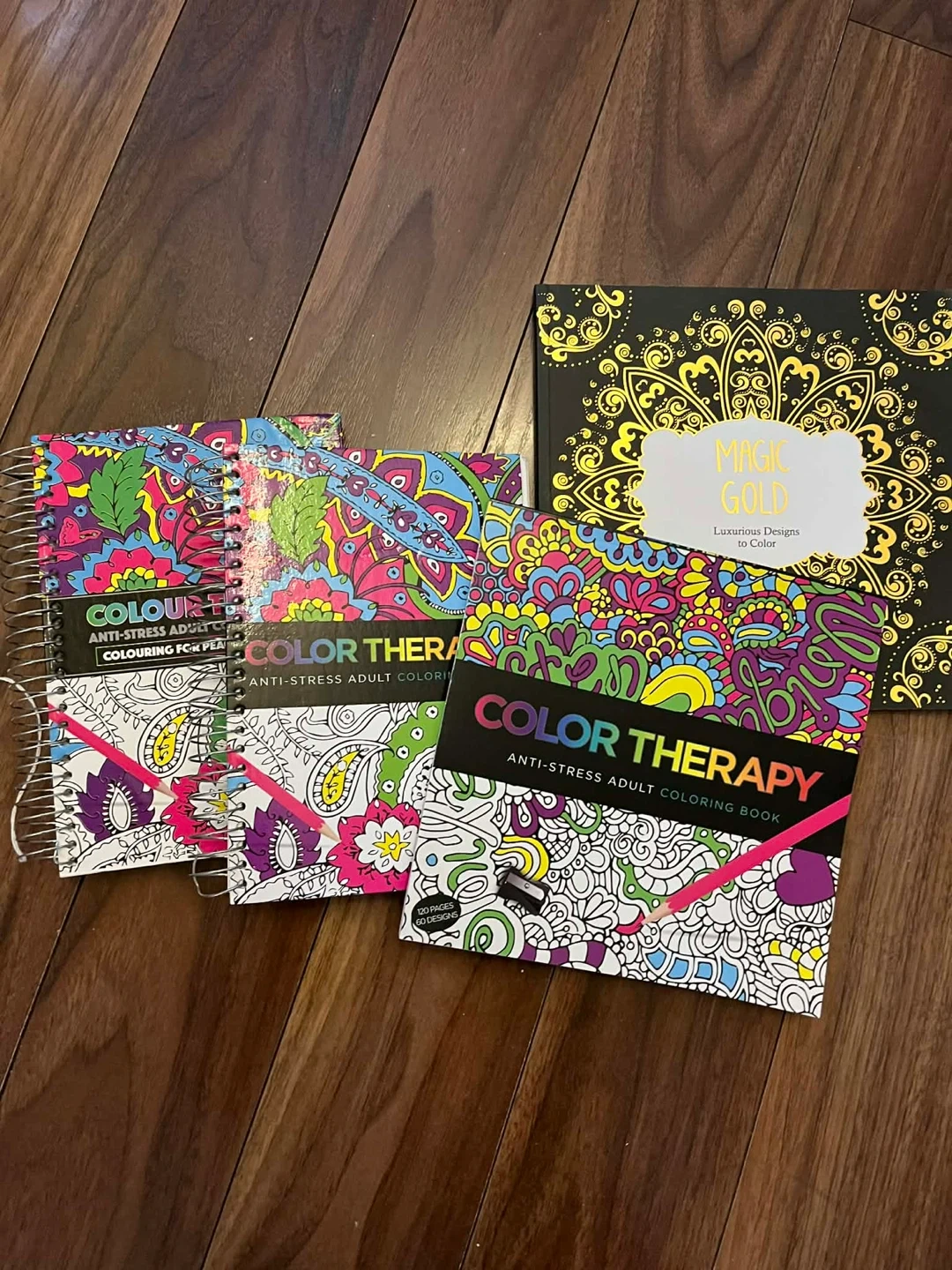 Get a set of four "Color Therapy" anti-stress adult colouring books, plus one "Magic Gold" book with luxurious designs. Each "Color Therapy" book has 120 pages and 60 designs. Perfect for unwinding and creative expression!