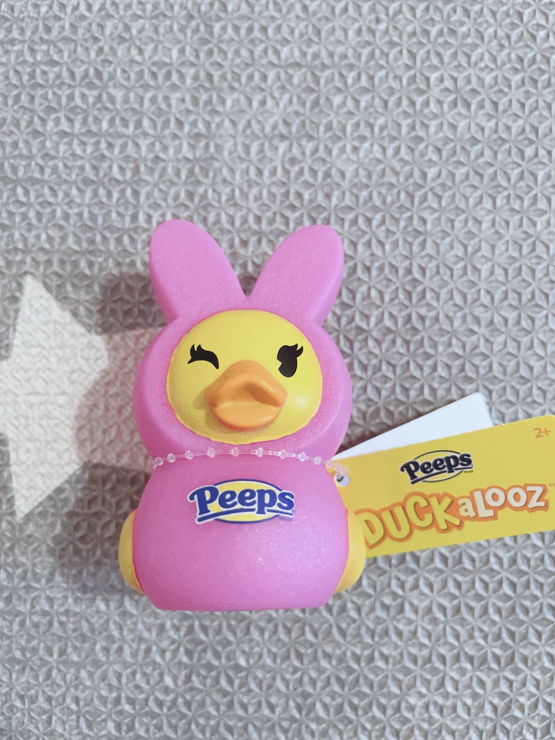 This is a Peeps Duckalooz squishy toy. It's designed to look like a duck wearing a pink bunny costume. Recommended for ages 2 and up. Perfect for Easter basket fillers or desk decor!