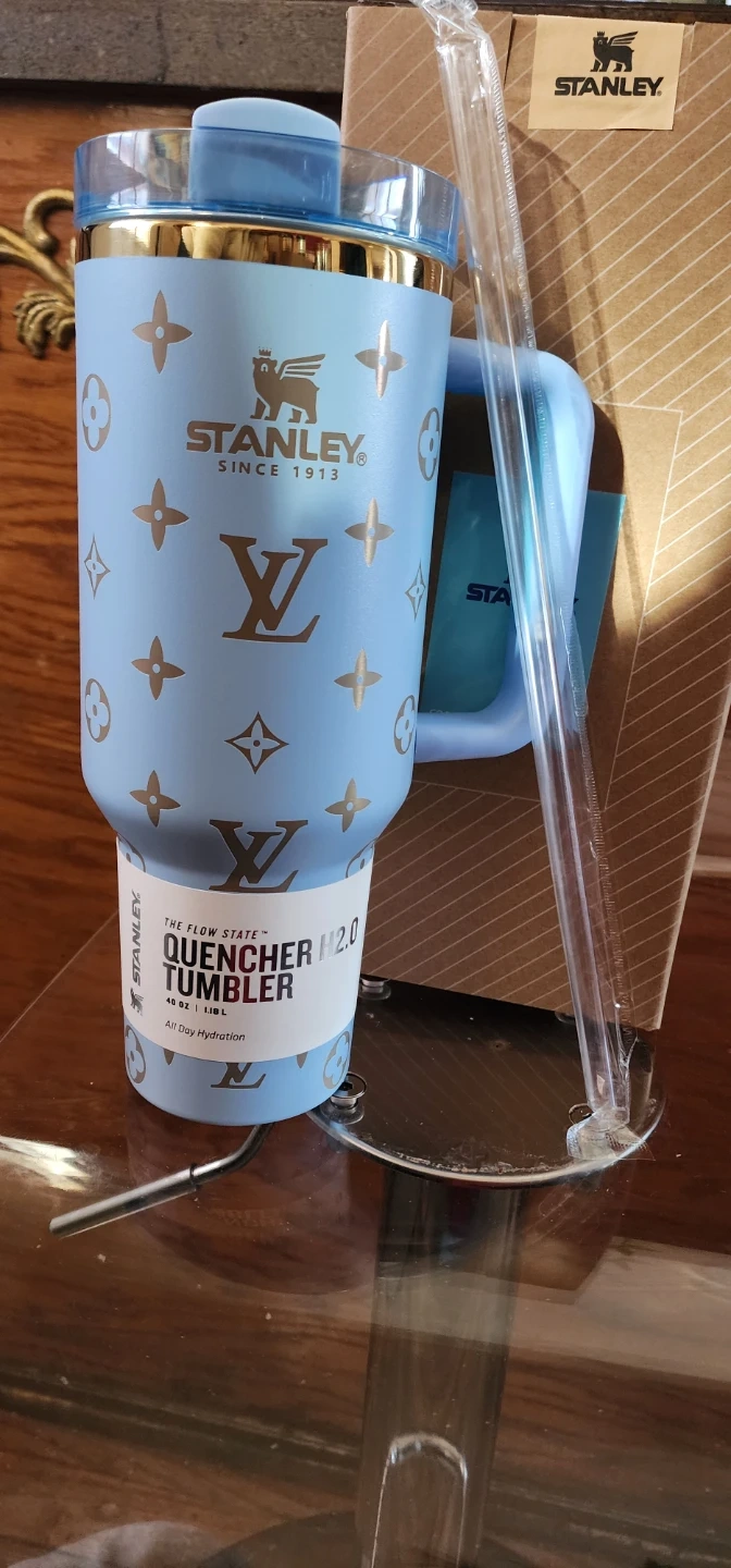 Stanley Quencher H2.0 tumbler in a light blue with LV print. It's 40 oz (1.18 L) and includes a straw. This tumbler is great for all-day hydration!