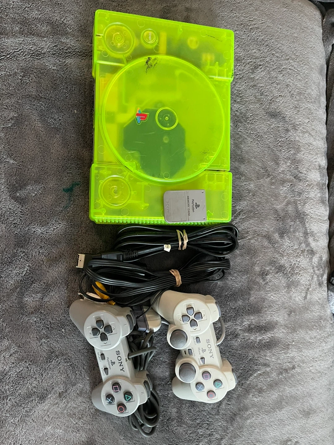 This is a translucent green Sony PlayStation 1 console. It comes with two original controllers, a memory card, and all necessary cables. Perfect for retro gaming enthusiasts!