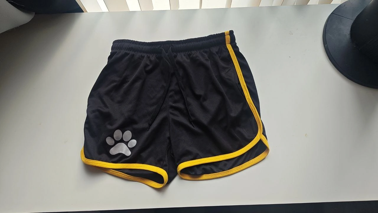 Men’s athletic/gym shorts – Size M. Black with yellow trim + paw print logo. Lightweight and comfy for gym, running, or lounging. Elastic waistband with drawstring.