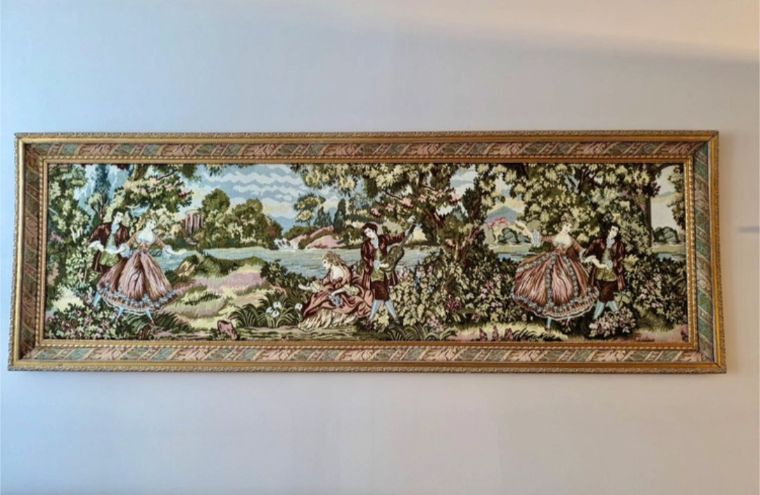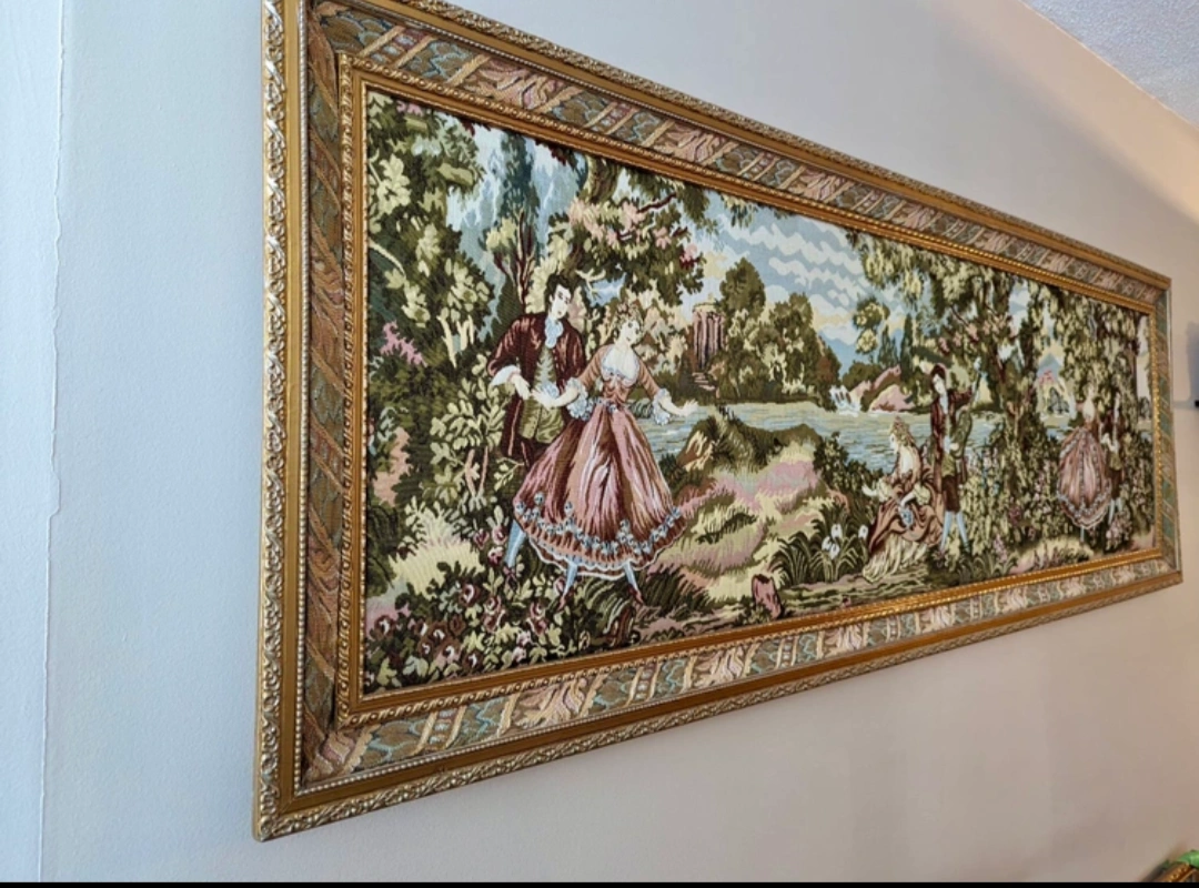Large Antique French Victorian Romantic Scene Tapestry Wall Art