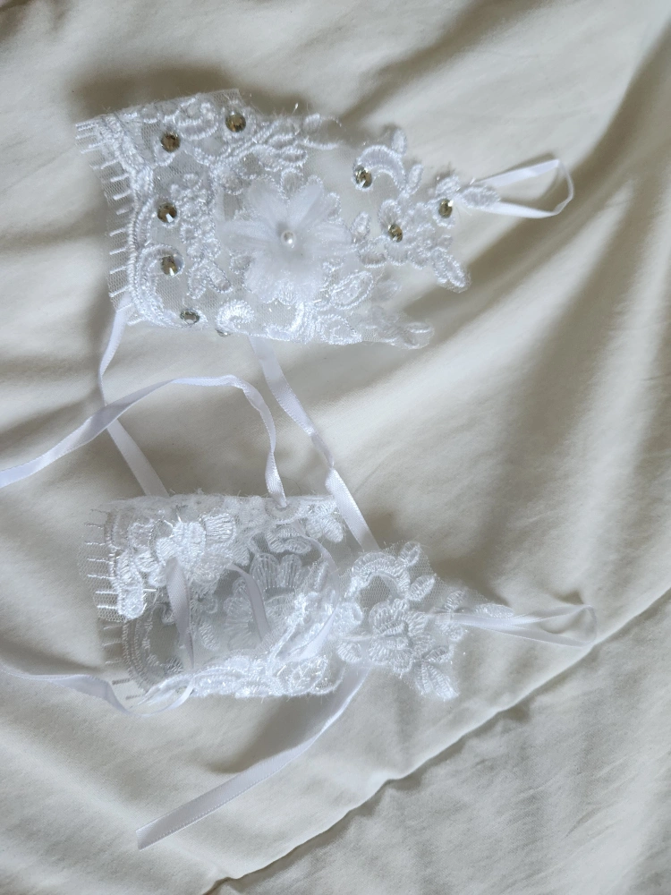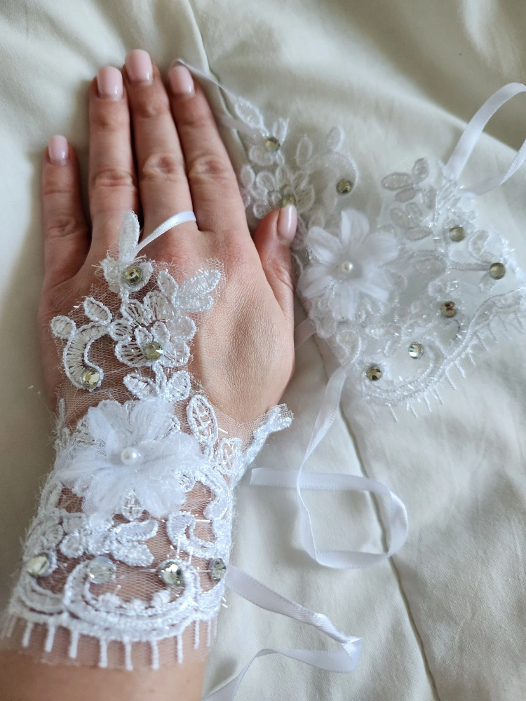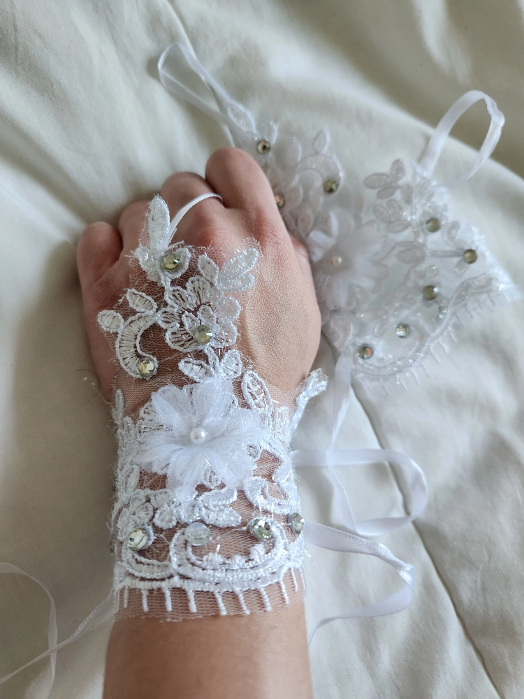 Never worn. These are a lovely pair of bridal white gloves with lace, flowers, and rhinestones. They are perfect for a wedding or other special occasion. They come with a ribbon tie in the back making it size adjustable.