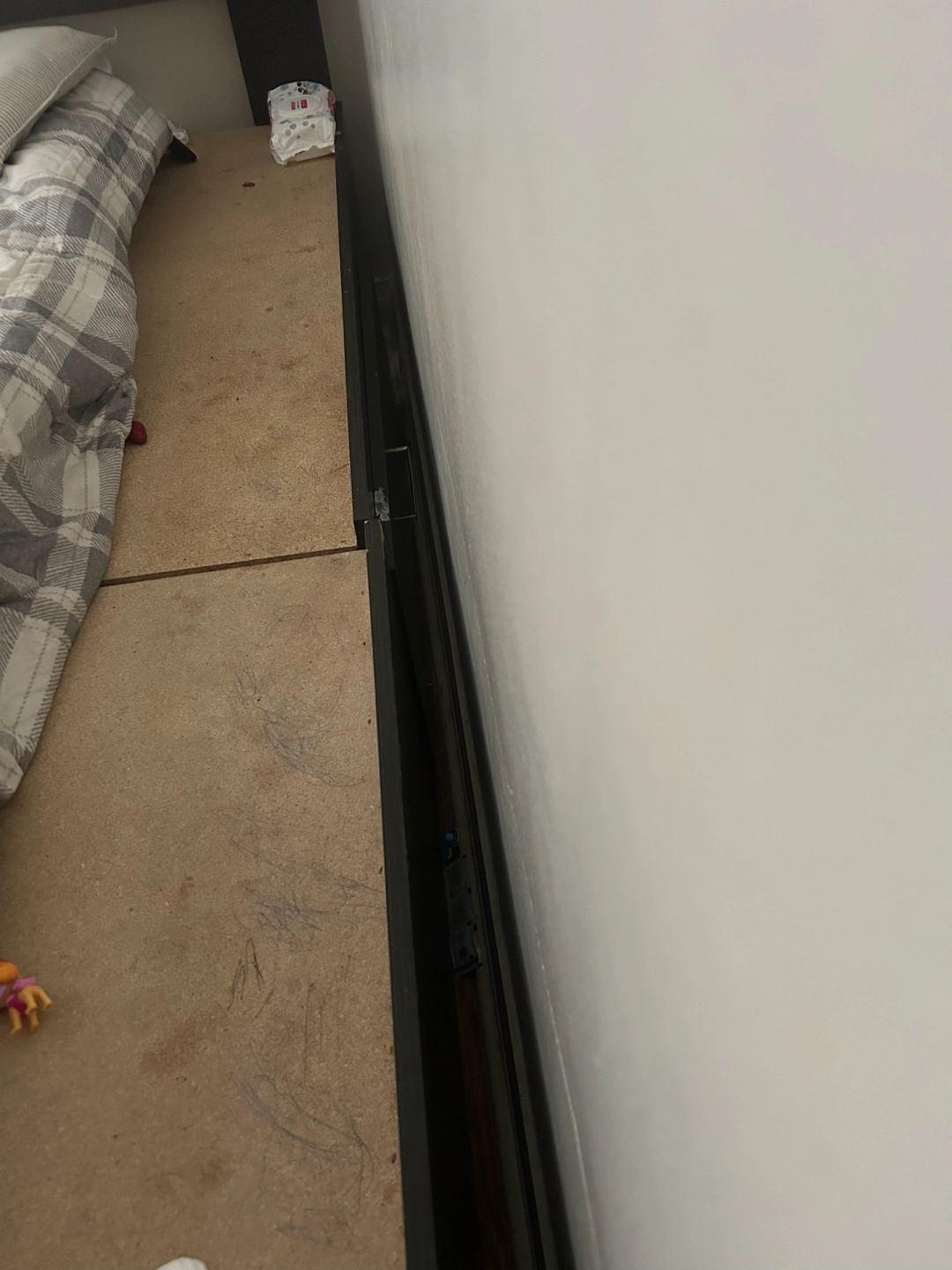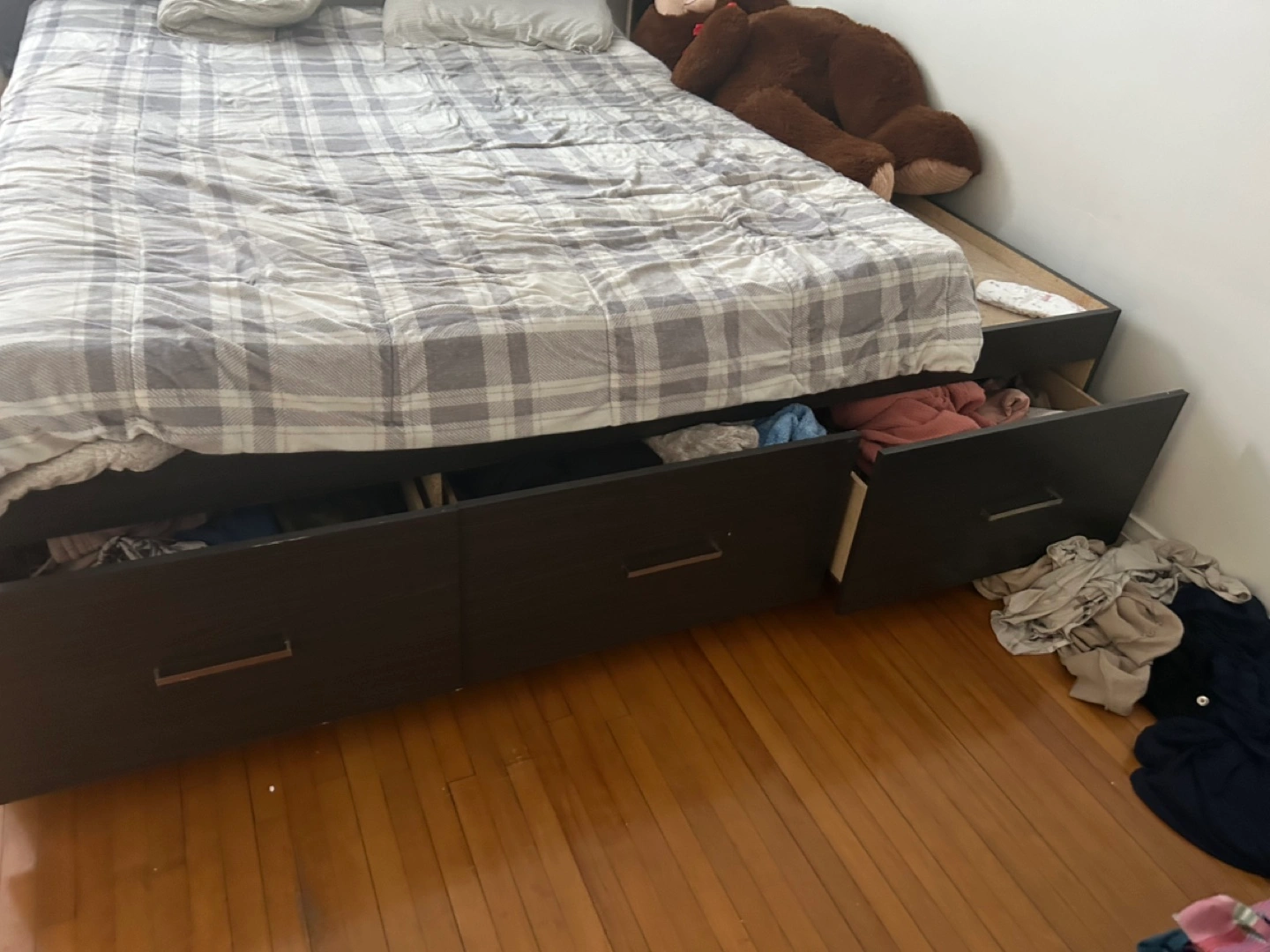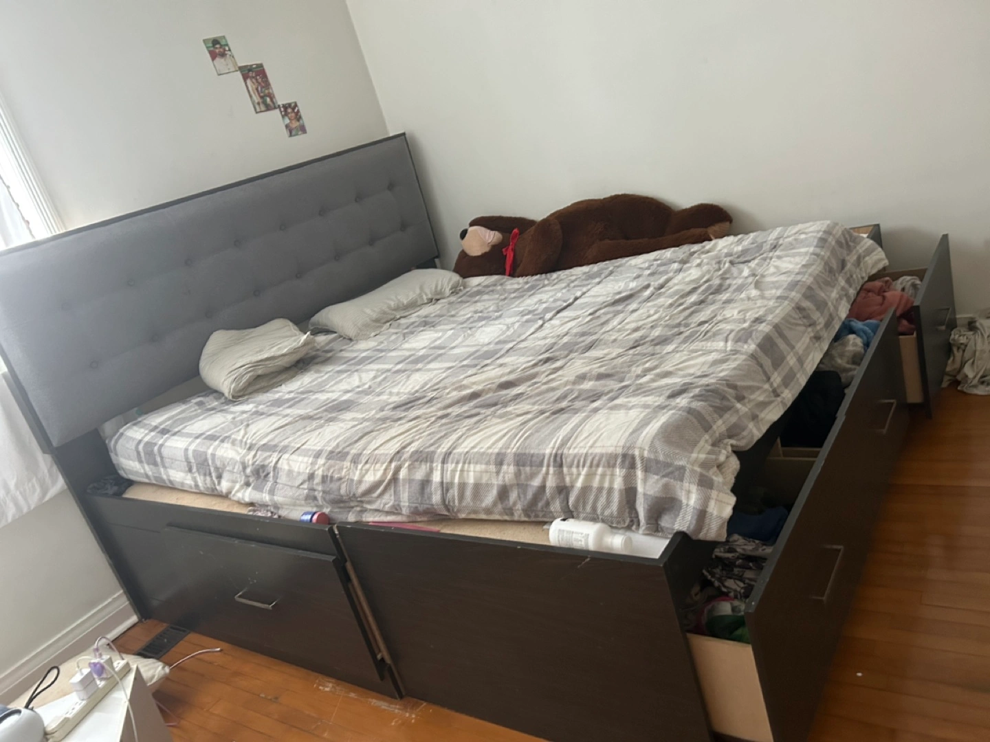 California king bed size bed frame, dark brown finish. Features a grey upholstered headboard with button tufting. Includes three large storage drawers underneath. Good used condition.