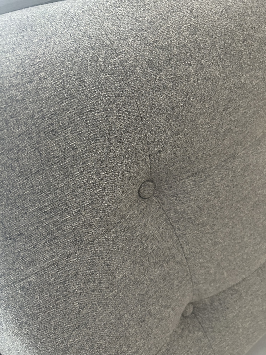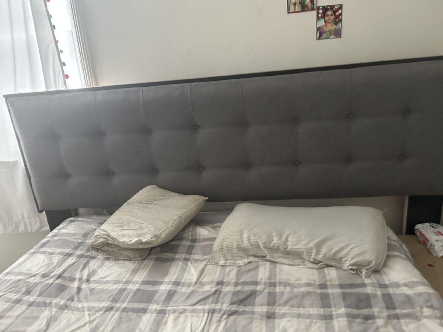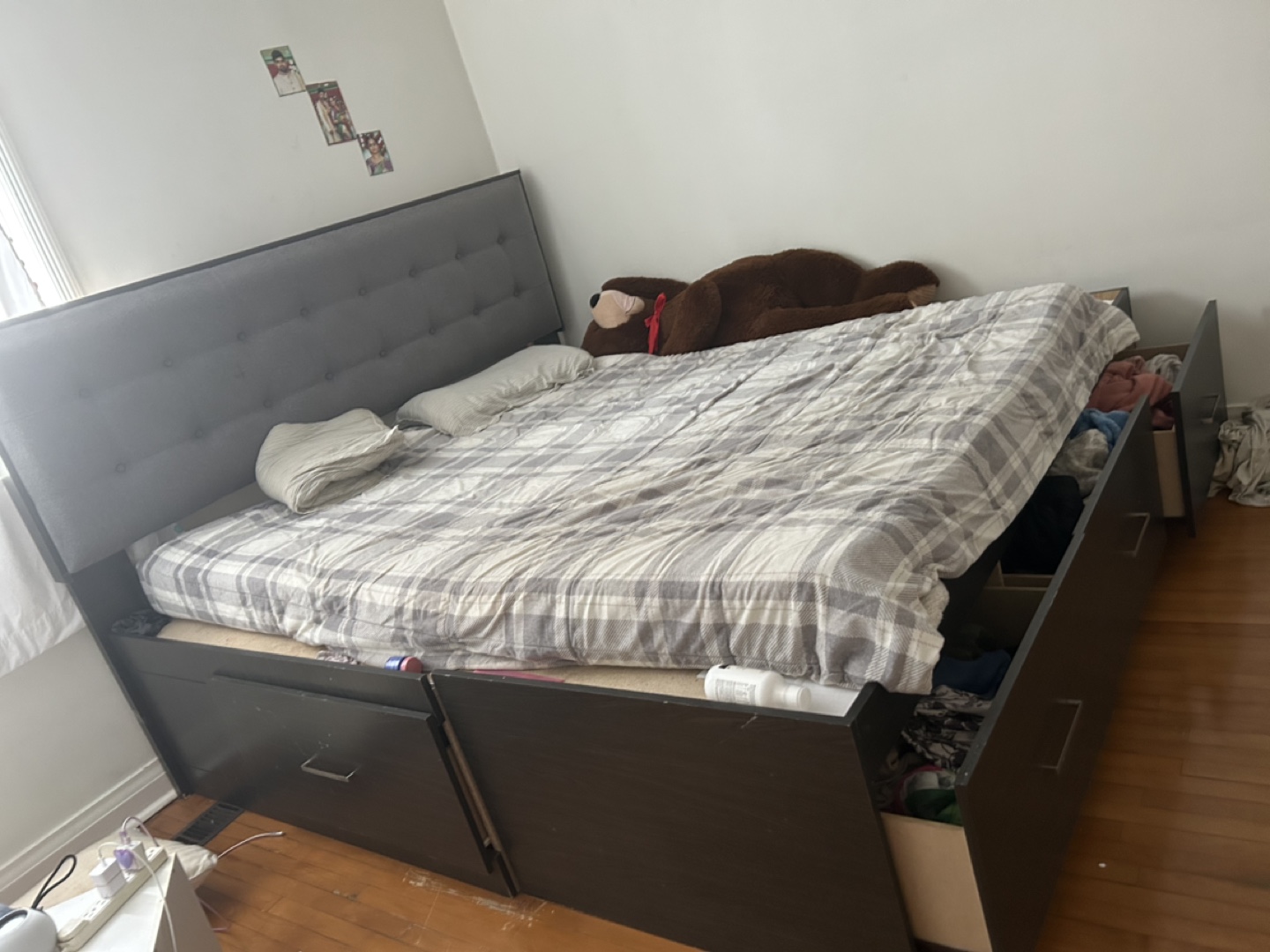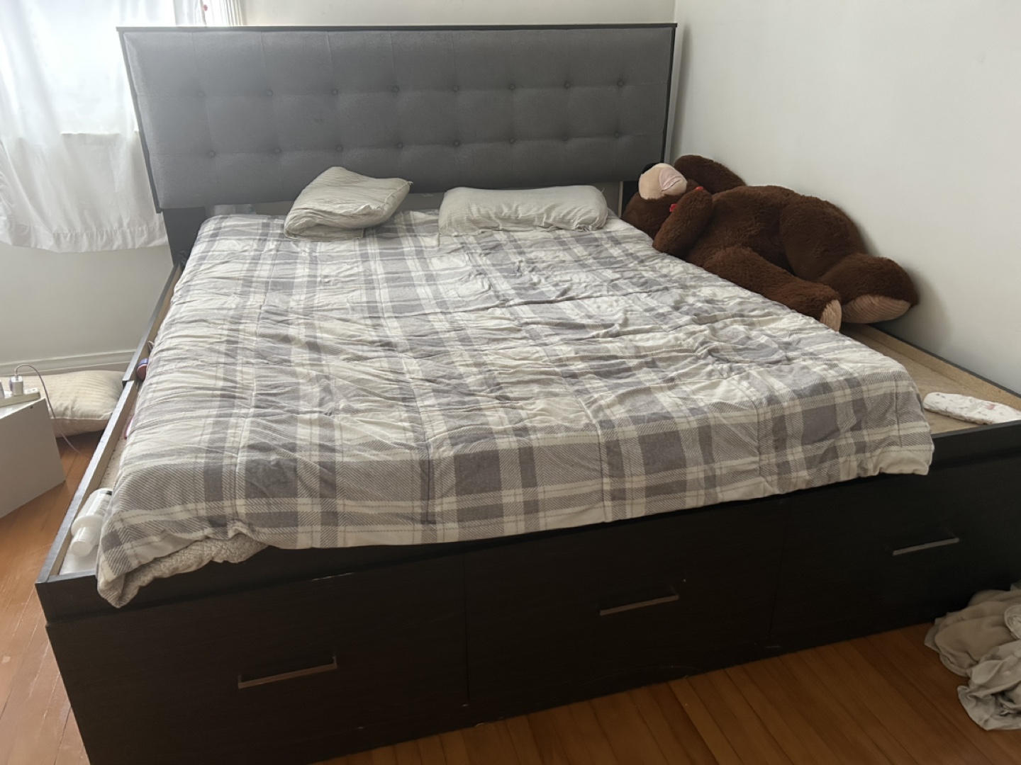 California king bed size bed frame, dark brown finish. Features a grey upholstered headboard with button tufting. Includes three large storage drawers underneath. Good used condition.