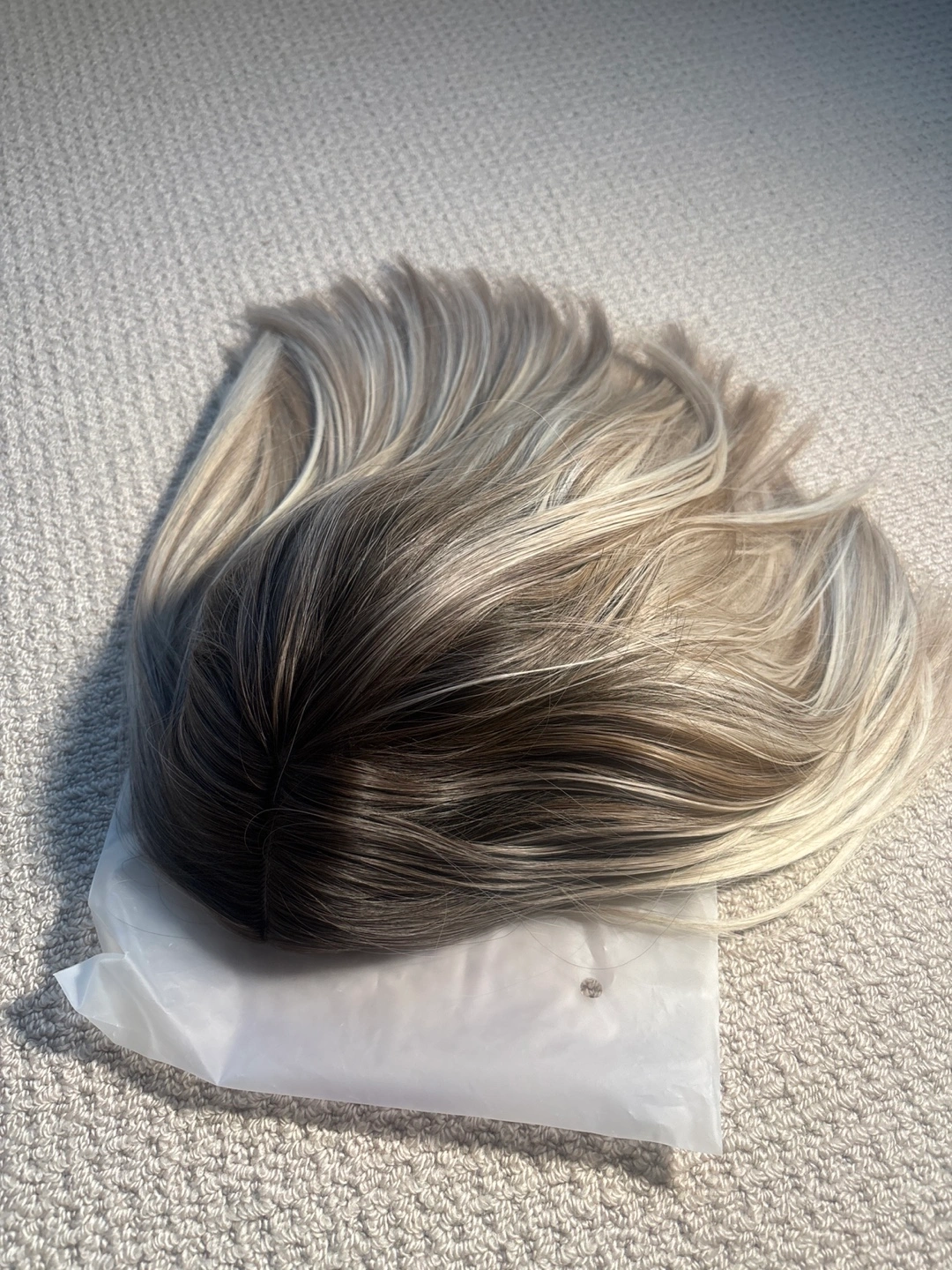 Beautiful half wig. Long, straight, ombre style. Brown roots blending into blonde highlights. Clip-in design. Comes in original packaging.