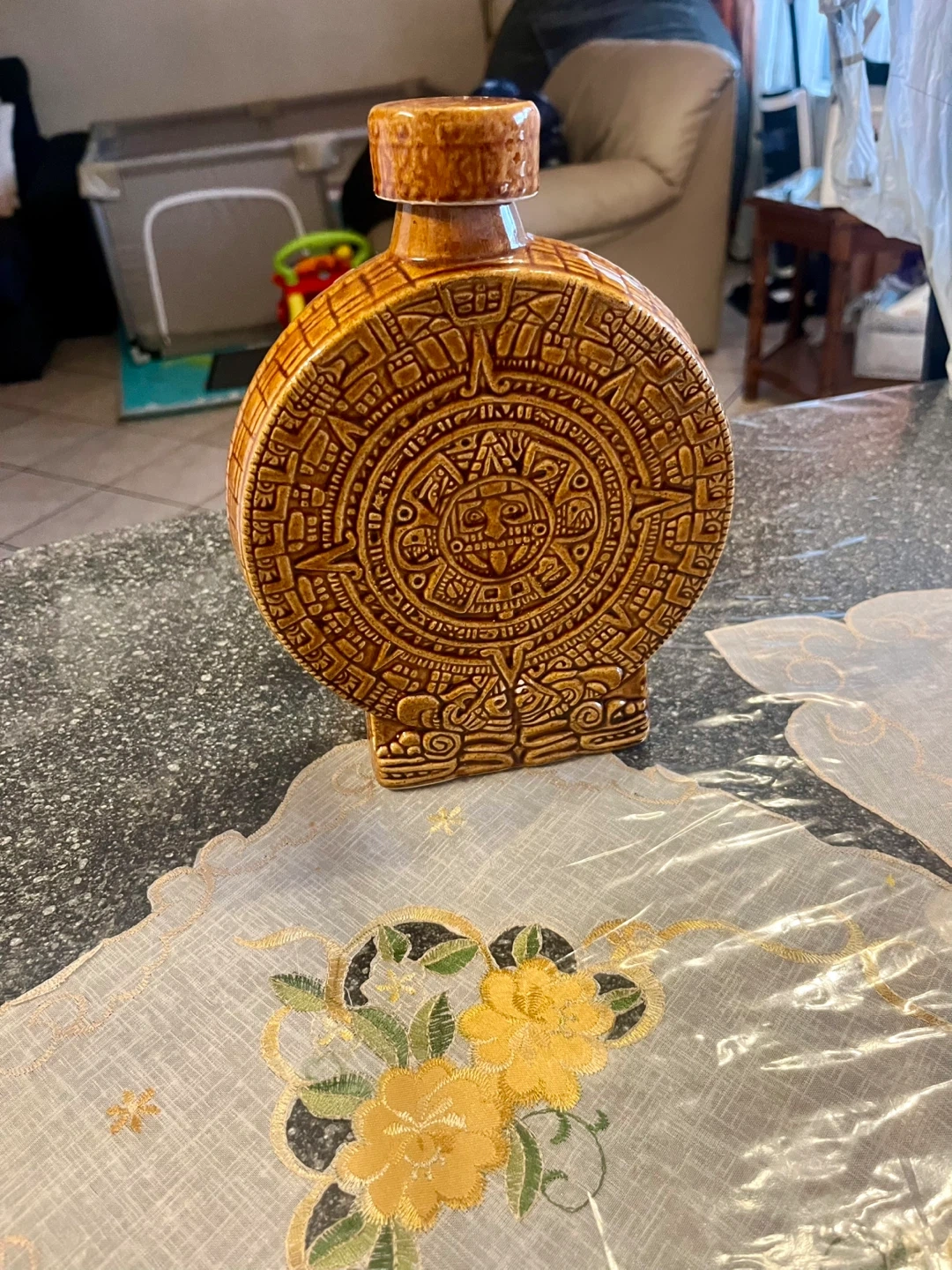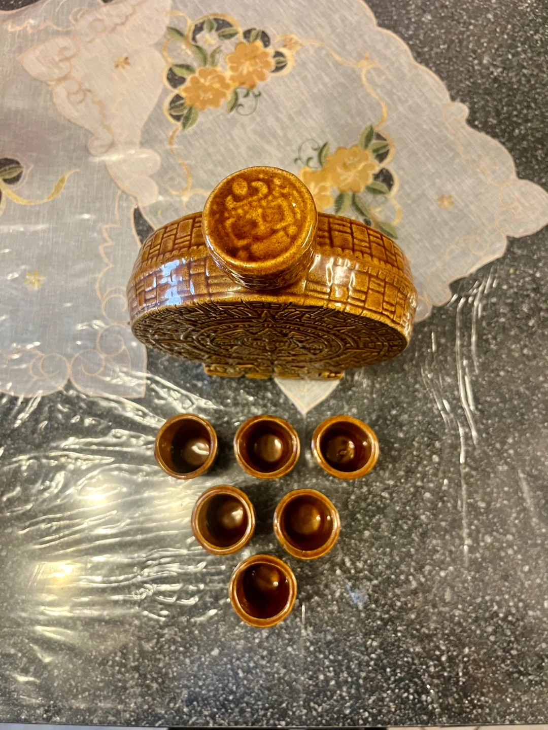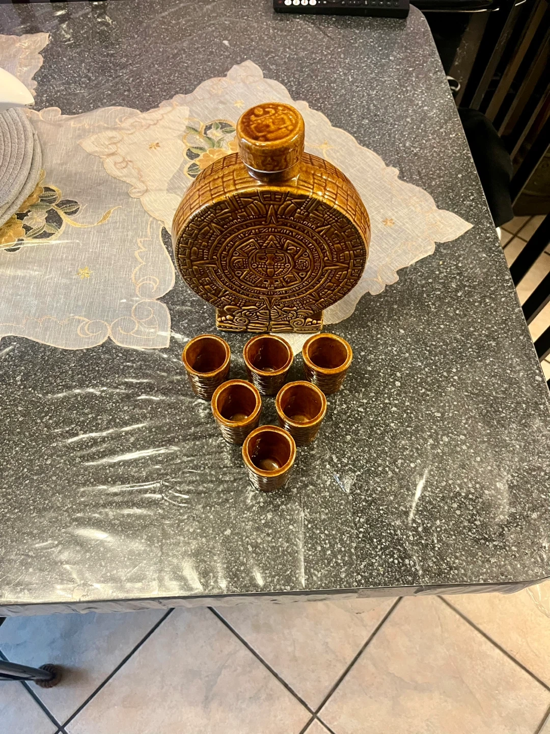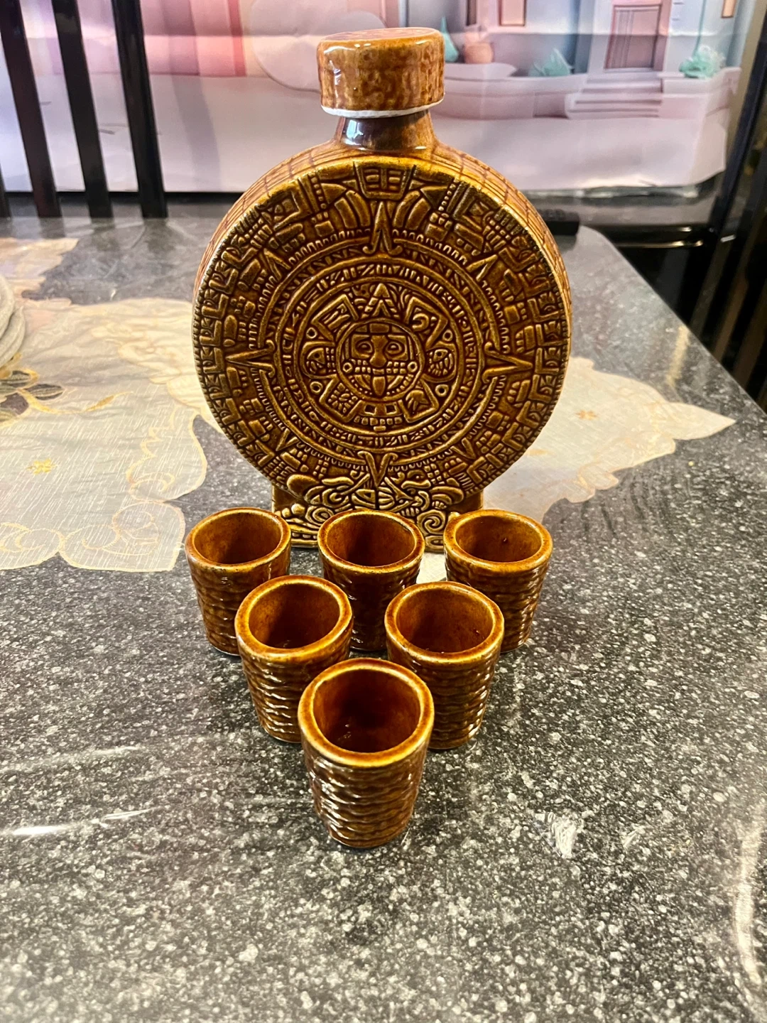 65This is a unique Aztec ceramic tequila set, complete with a decanter and six shot glasses, showcasing intricate Aztec calendar designs. The set is in never used, good condition, perfect for adding a cultural touch to your bar or as a decorative piece. * Includes one decanter and six shot glasses * Features detailed Aztec calendar designs * Material: Ceramic Add a touch of ancient civilization to your home bar! And remember, if the ad is up, it's still available, no need to ask! Based on similar listings on online, a set like this would typically sell for between $30 and $60, depending on the condition and uniqueness. Given the good condition and distinctive design, I've priced it at $40.