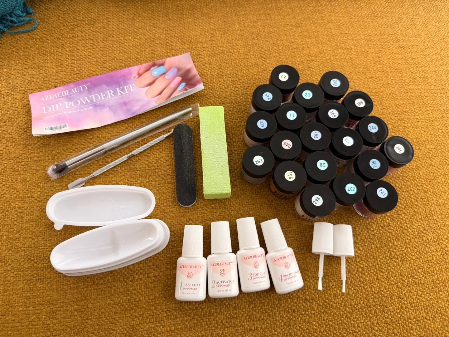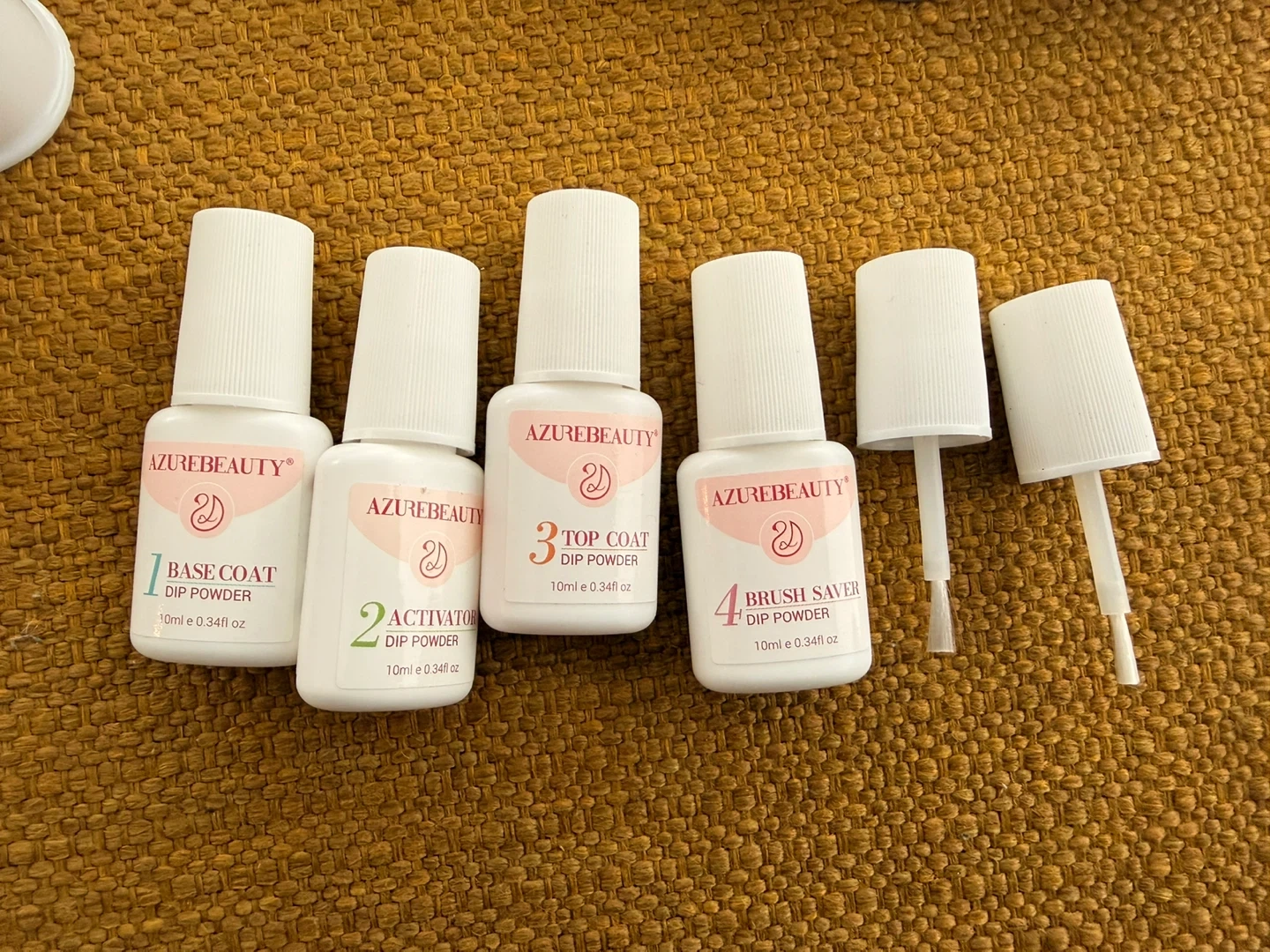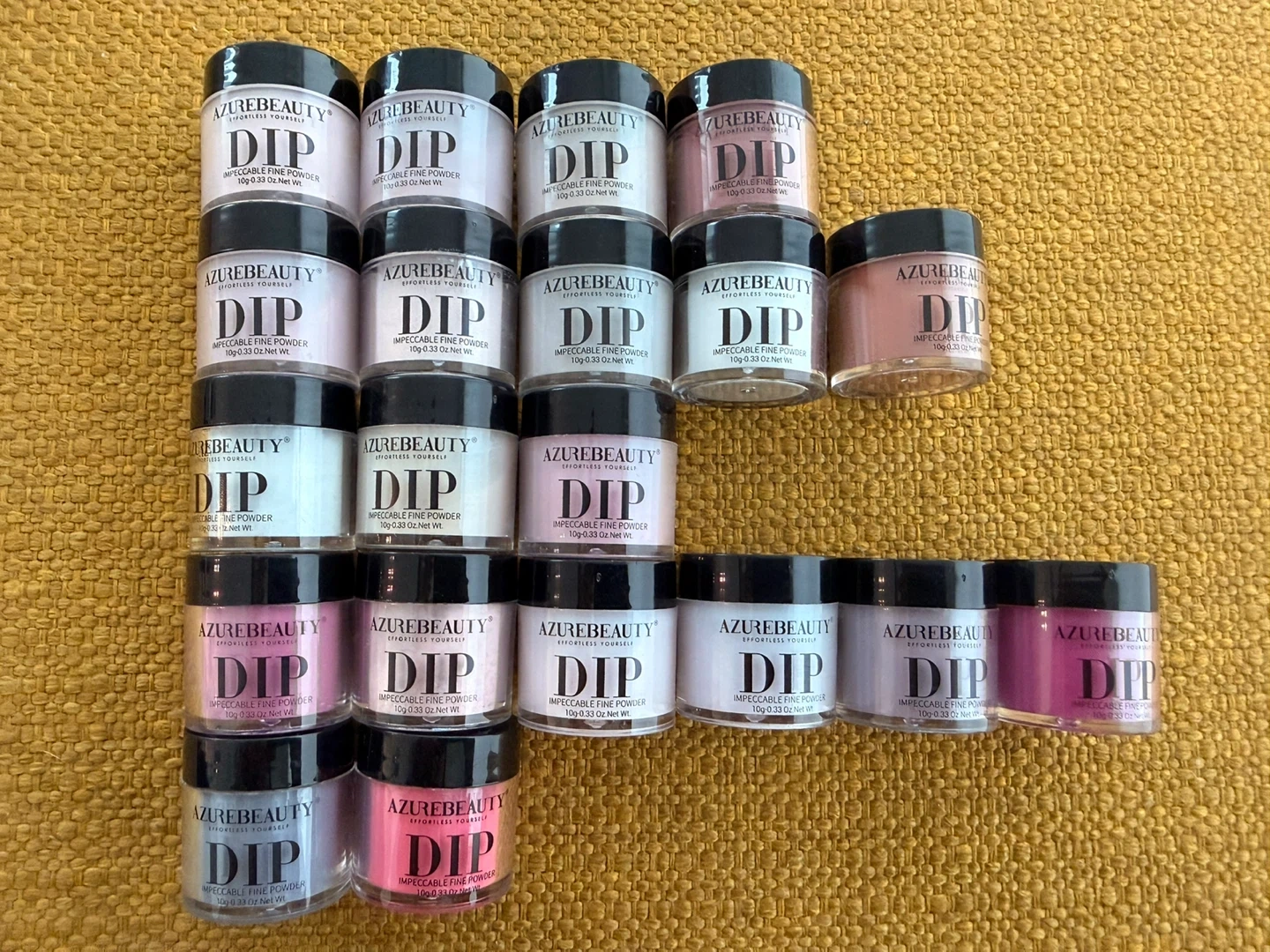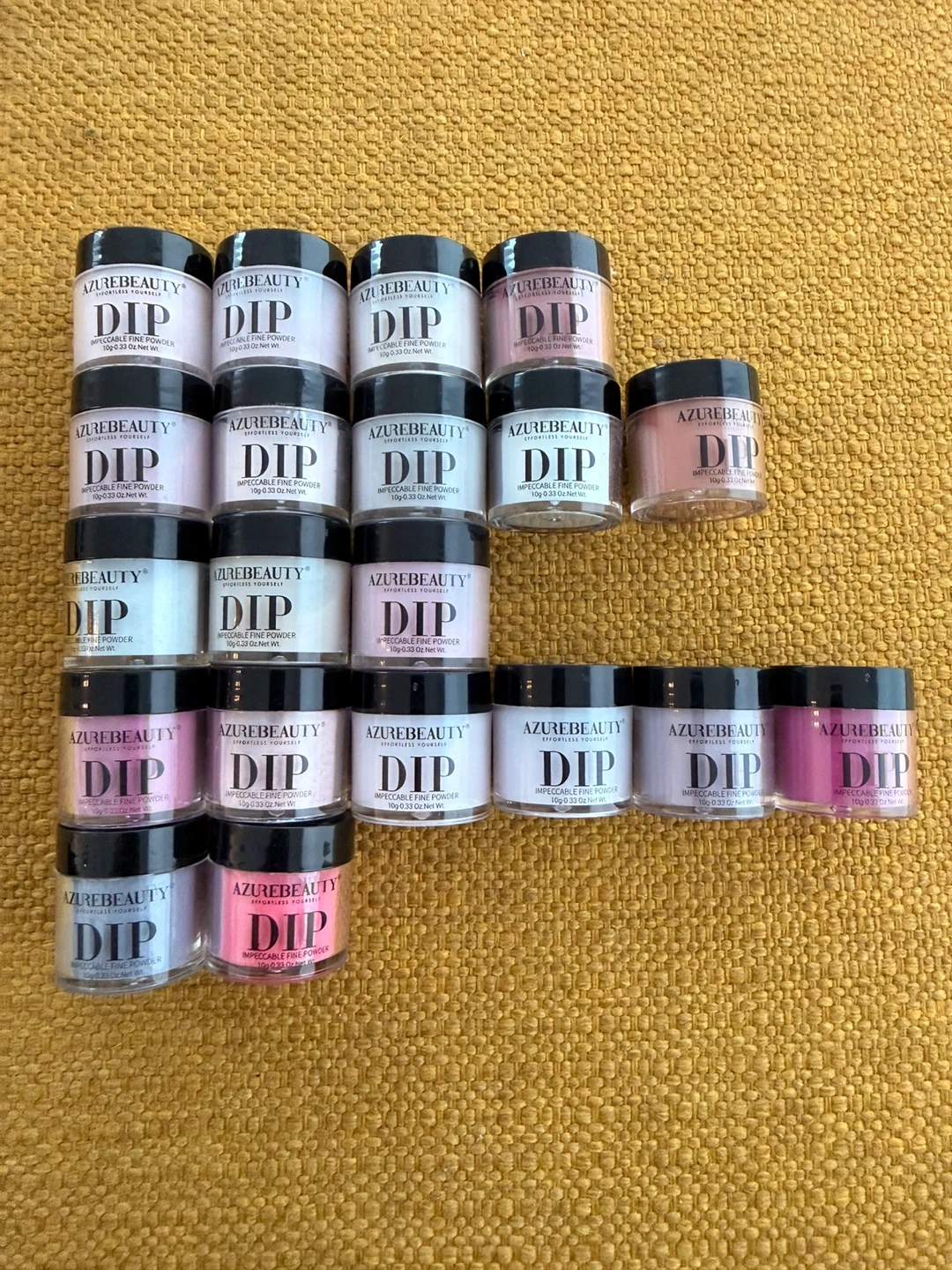 65Selling a complete AzureBeauty Dip Powder Nail Kit! It includes everything you need for beautiful dip powder manicures at home. There are 20 powder colours, base coat, activator, top coat, and brush saver included! Used just a few times!!