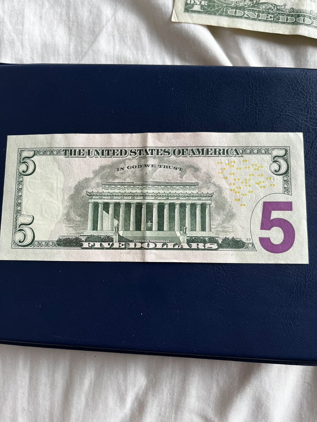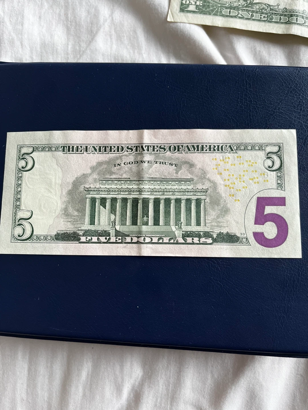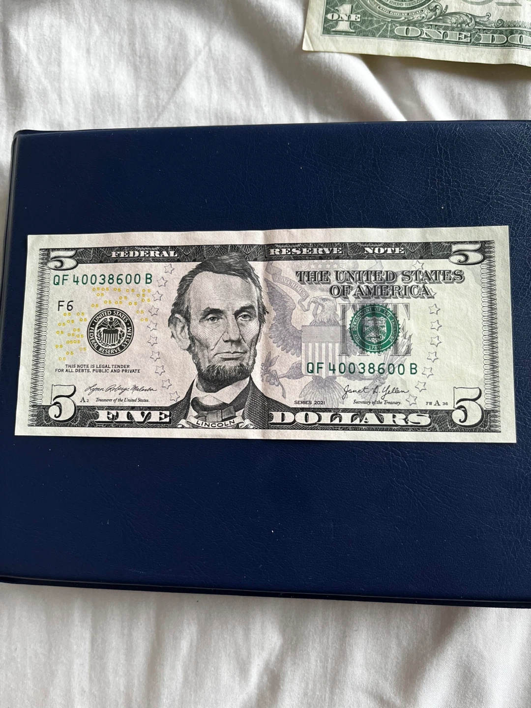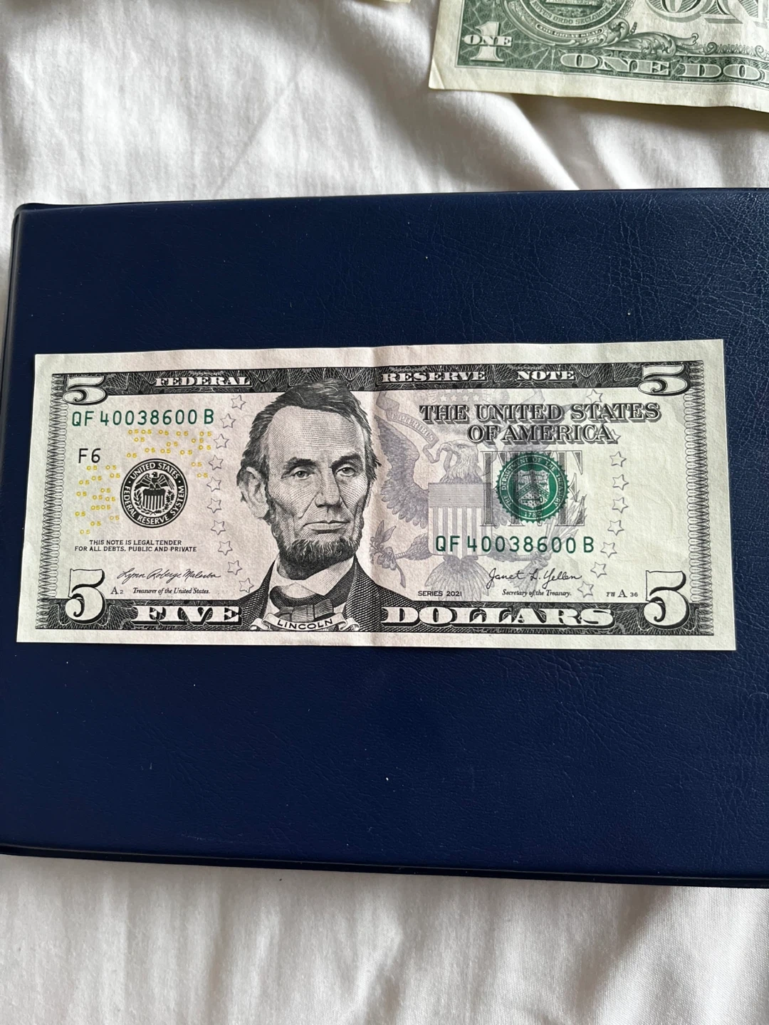 This is a U.S. Federal Reserve Note for five dollars, featuring Abraham Lincoln on the front. It's from the Series 2021 with a distinct purple and green ink colour scheme. The reverse shows the Lincoln Memorial.