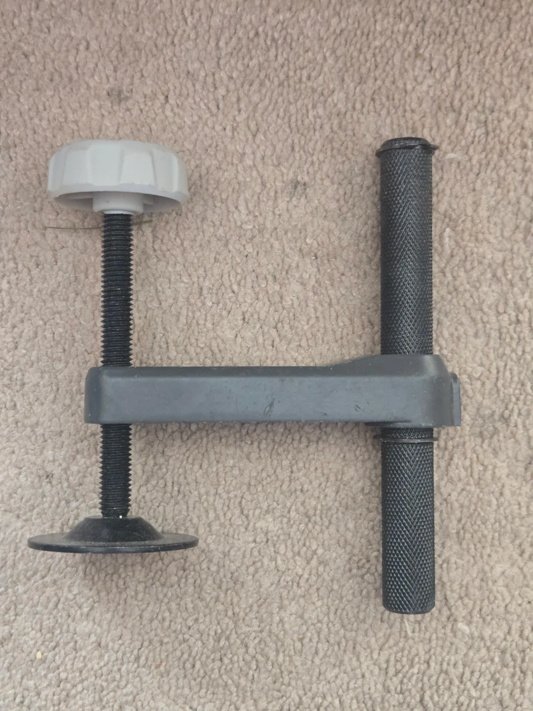 ryobi Miter saw adjustable clamp with two knobs. It's made of grey and black plastic and metal. The clamp has a threaded rod and a rotating base for tightening. It also features a textured handle for grip.