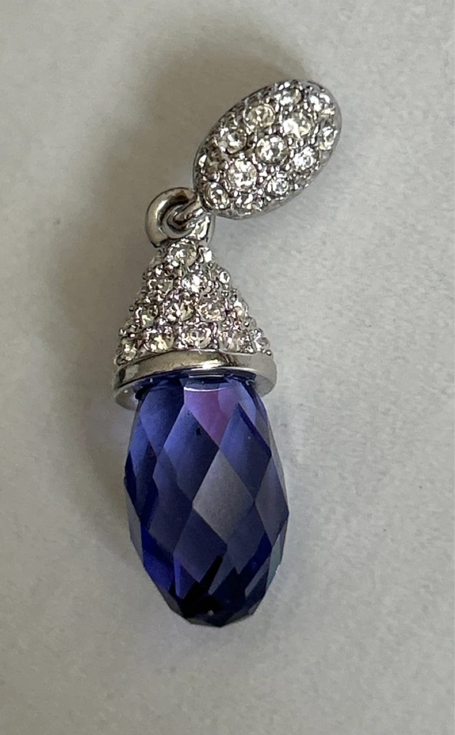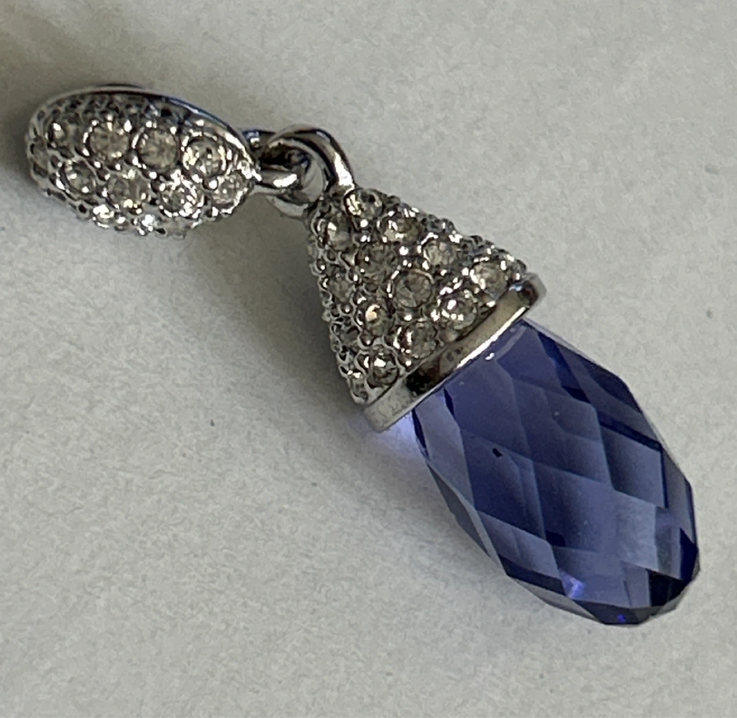 Silver-toned pendant featuring a faceted blue/purple gemstone and a cone-shaped bail encrusted with small rhinestones. It's a nice accent piece!