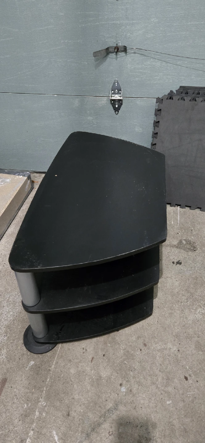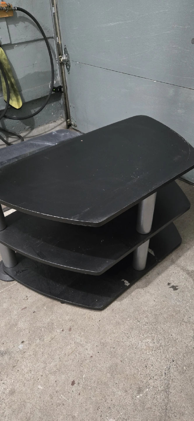 Selling a black TV stand with three shelves. It's perfect for organizing your media devices and accessories. It has some signs of use, but it's still in good condition and ready for a new home