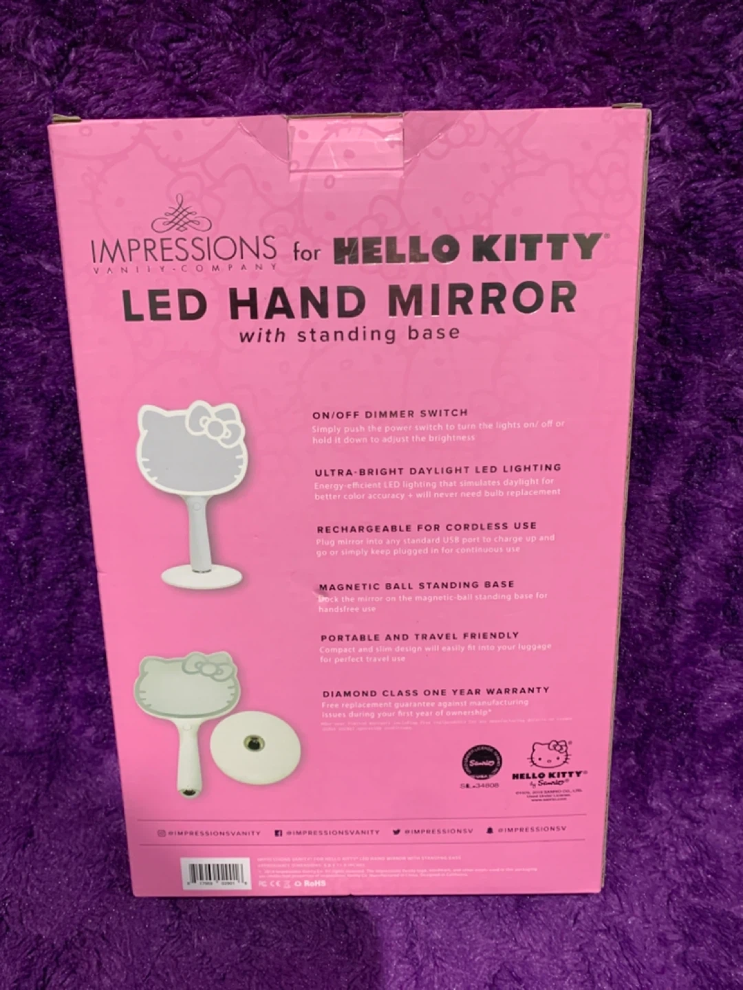 This Impressions for Hello Kitty LED hand mirror comes with a standing base and charging cable. It's perfect for touch-ups and makeup application anywhere. The mirror lights up for better visibility.