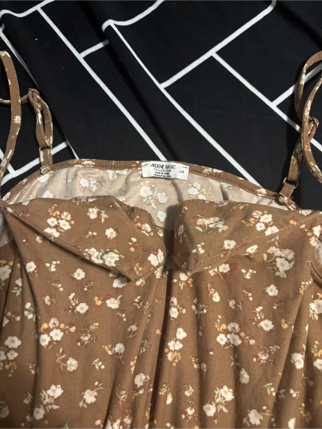 Ardene Basic sleeveless romper with a brown floral print. It has a cinched elastic waist and adjustable spaghetti straps. Size L/G.