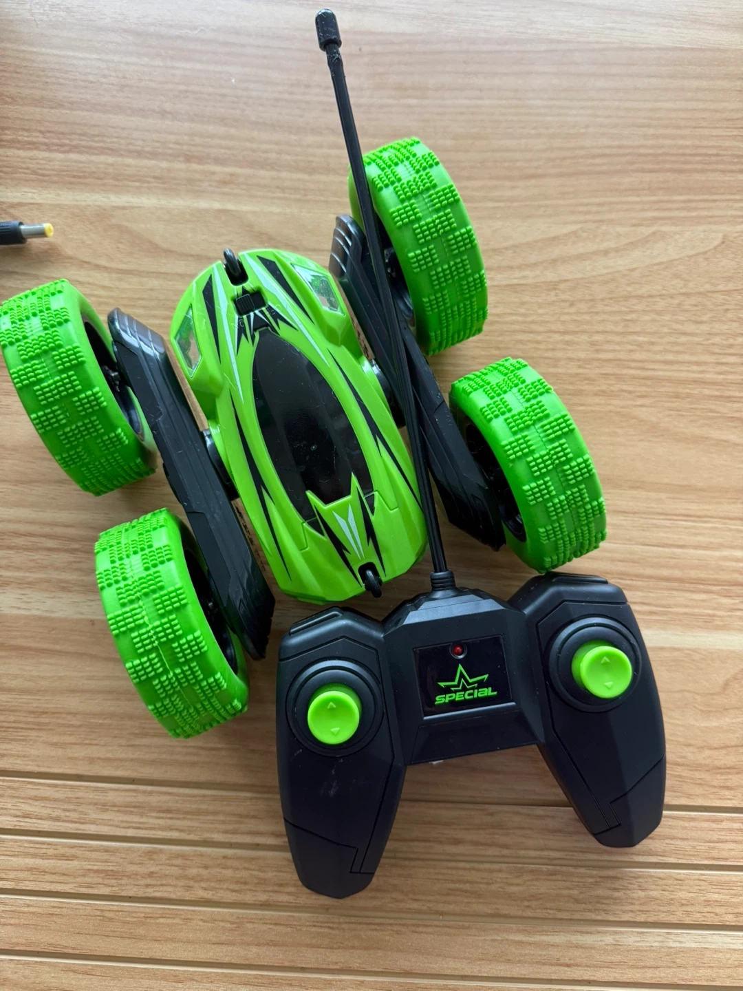 This is a bright green remote control stunt car with big treaded wheels. It comes with a black remote control featuring green accents. The car is designed to perform flips and stunts! It's ready for outdoor adventures.
