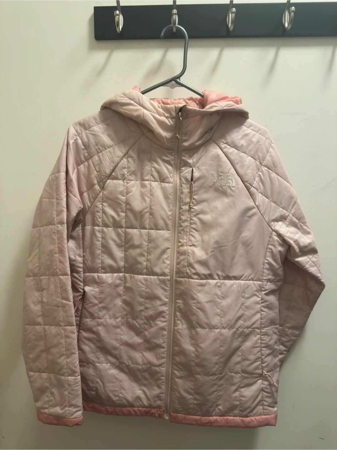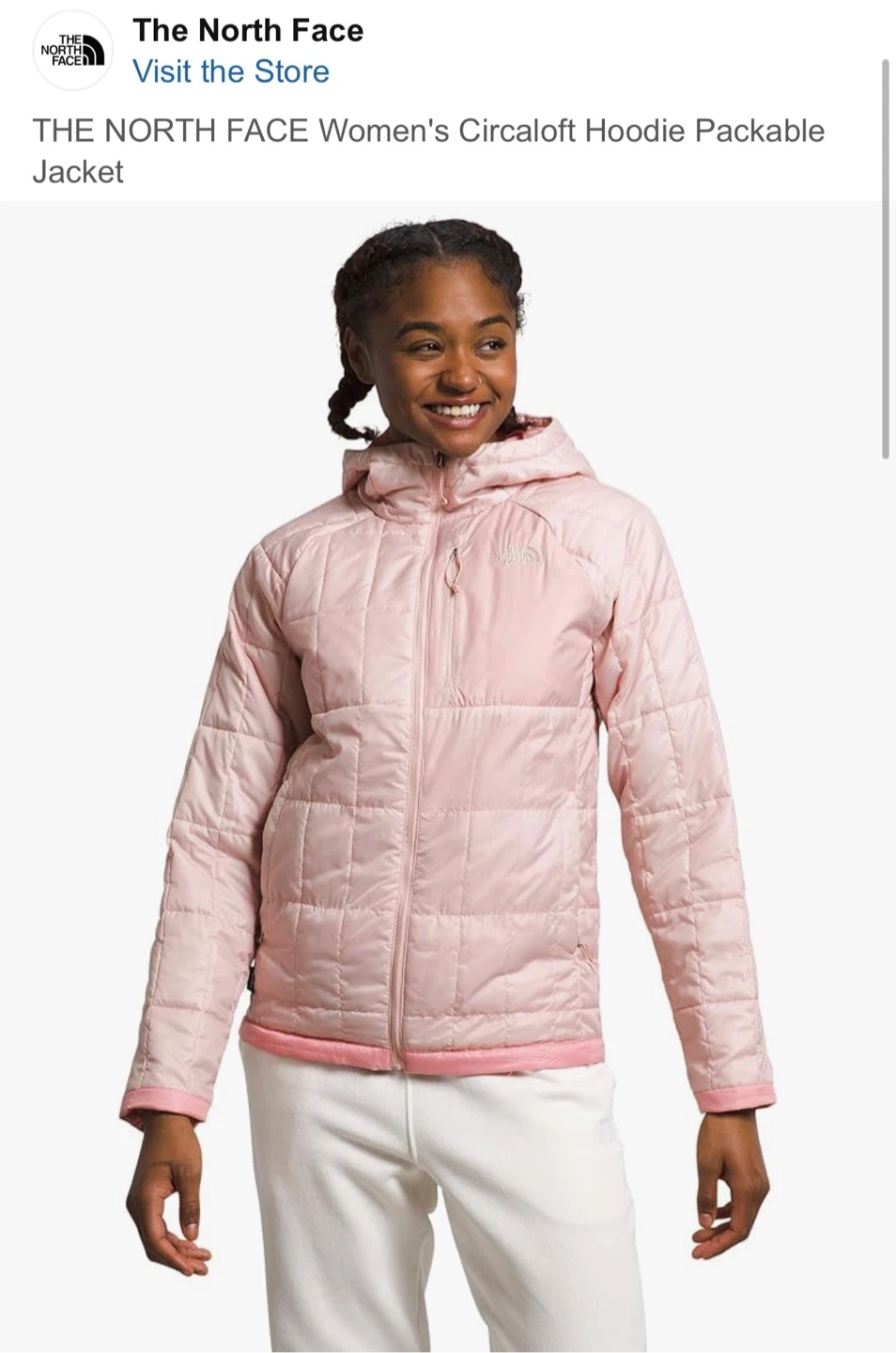 Pink quilted hoodie jacket. It's a packable design with a full zip closure and a hood. This jacket's light and warm, perfect for layering and spring weather. Slim fit