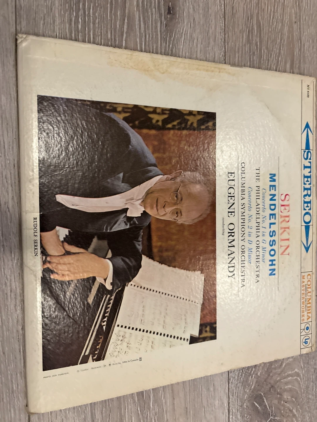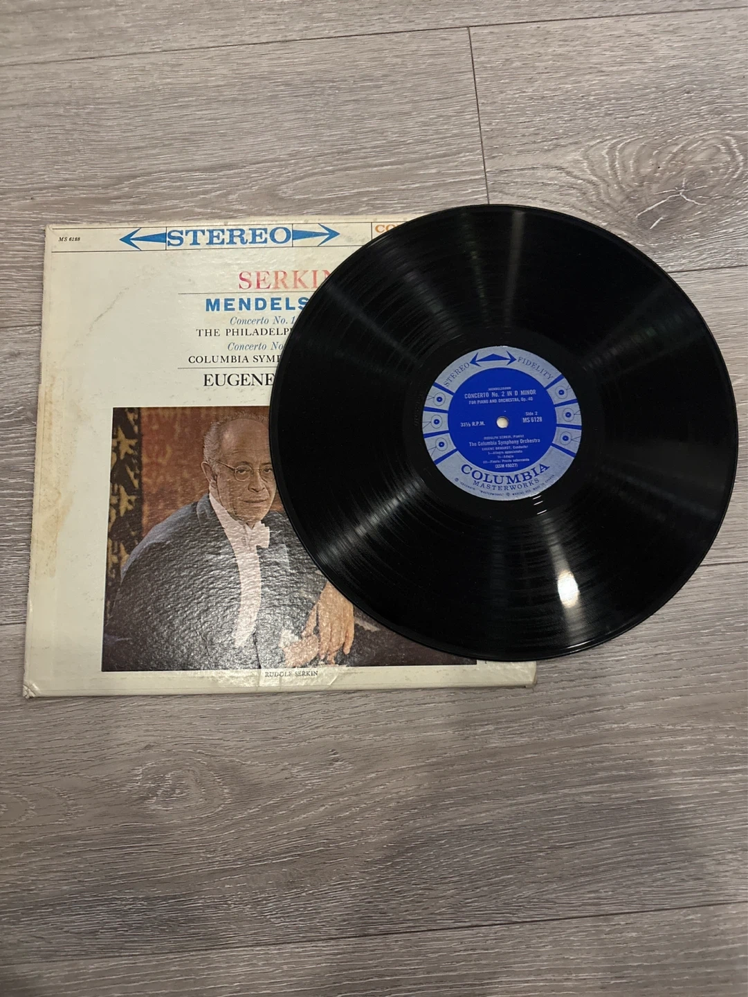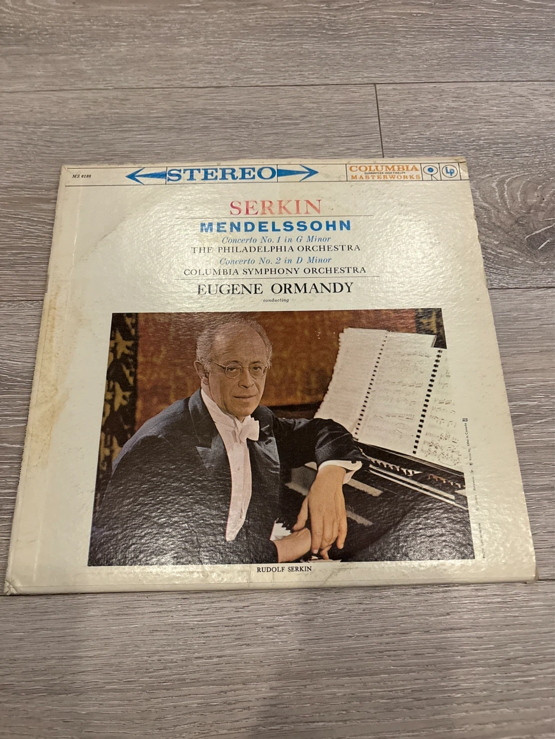This is a stereo vinyl record of Mendelssohn's Piano Concerto No. 1 in G Minor. It features Rudolf Serkin on piano and the Columbia Symphony Orchestra conducted by Eugene Ormandy. This record is from Columbia Masterworks. Collectible