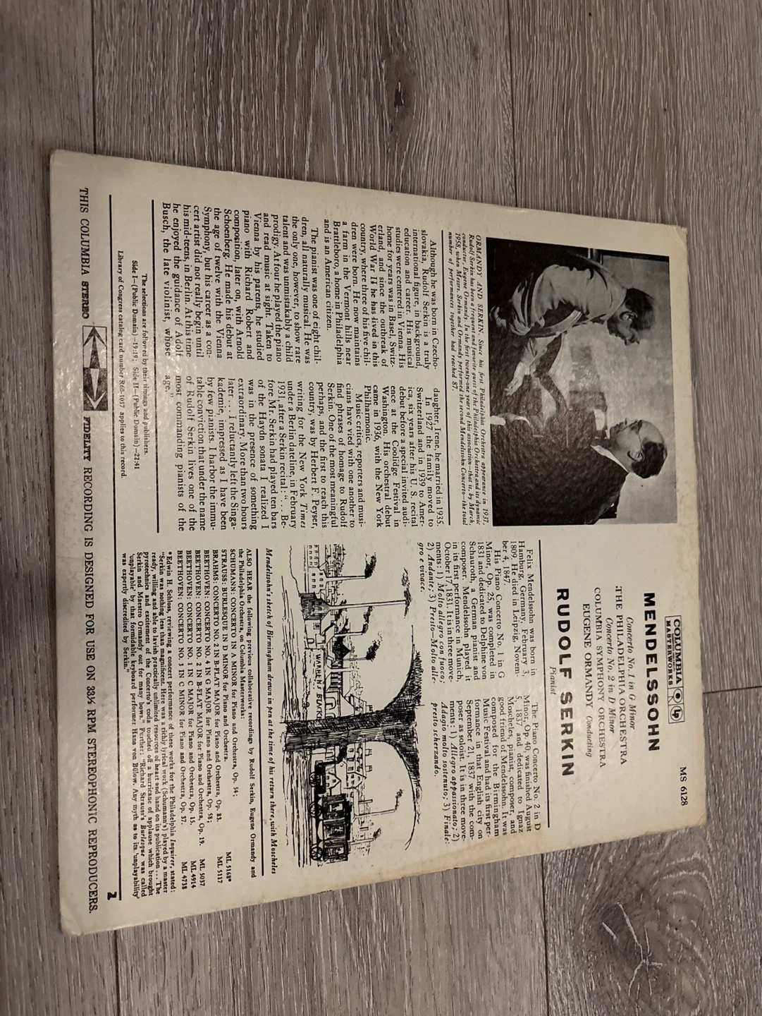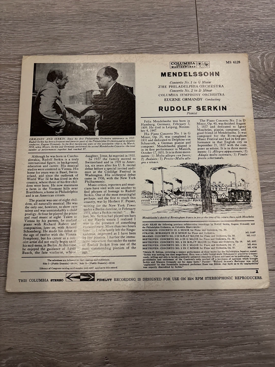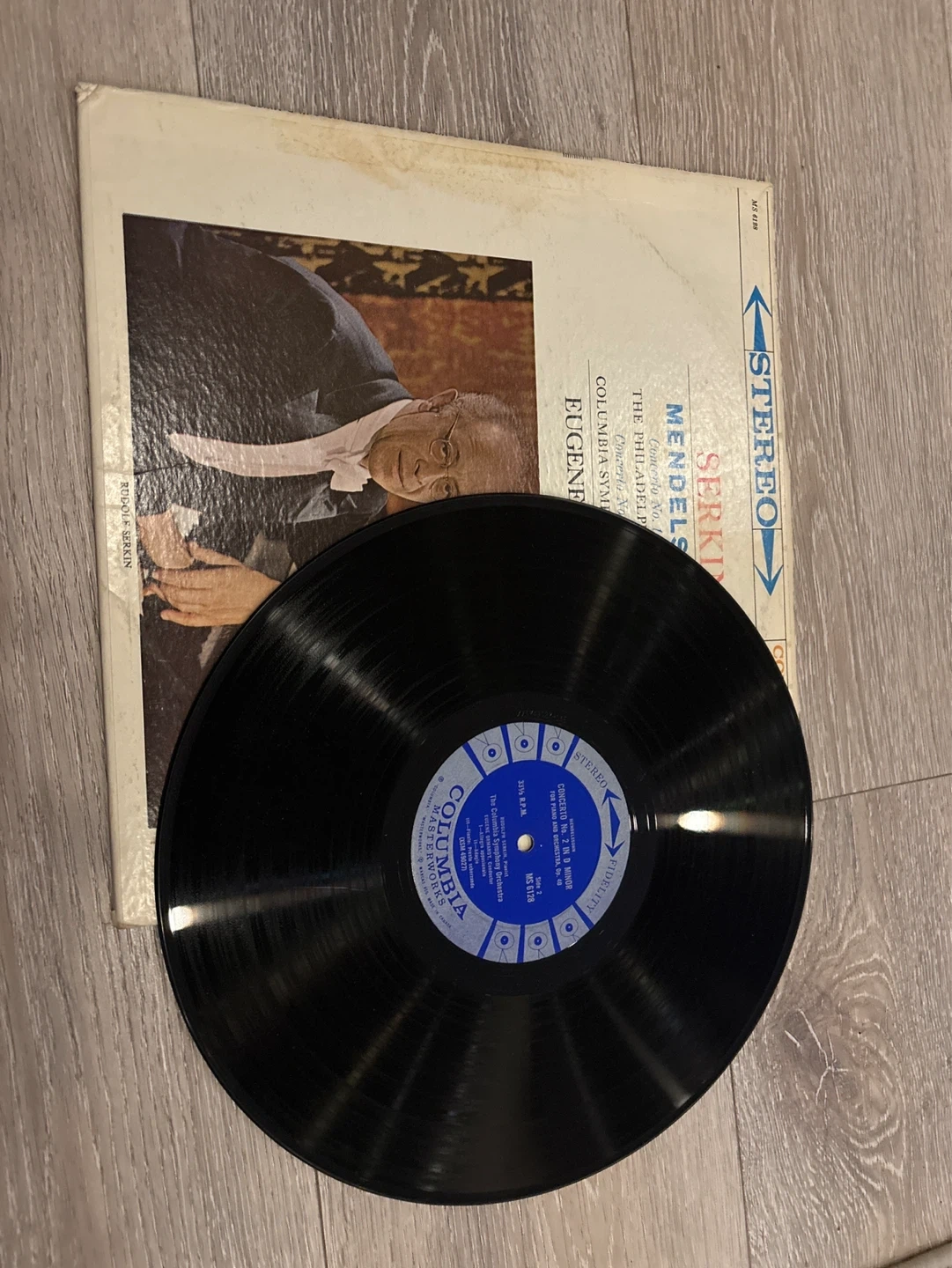 This is a stereo vinyl record of Mendelssohn's Piano Concerto No. 1 in G Minor. It features Rudolf Serkin on piano and the Columbia Symphony Orchestra conducted by Eugene Ormandy. This record is from Columbia Masterworks. Collectible