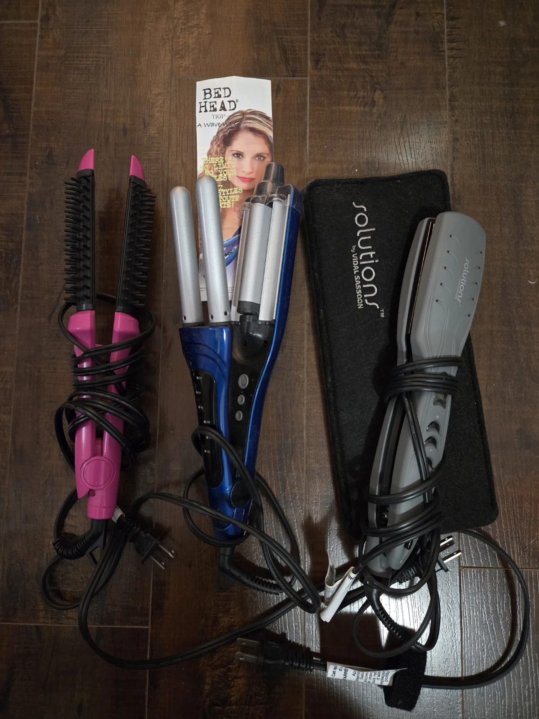 This bundle includes a Bed Head TIGI A Wave Artist waver and a Solutions by Vidal Sassoon hair straightener. The waver has three barrels for creating waves. The straightener comes with a black felt heat-resistant mat. Hardly been used, but boxes are missing