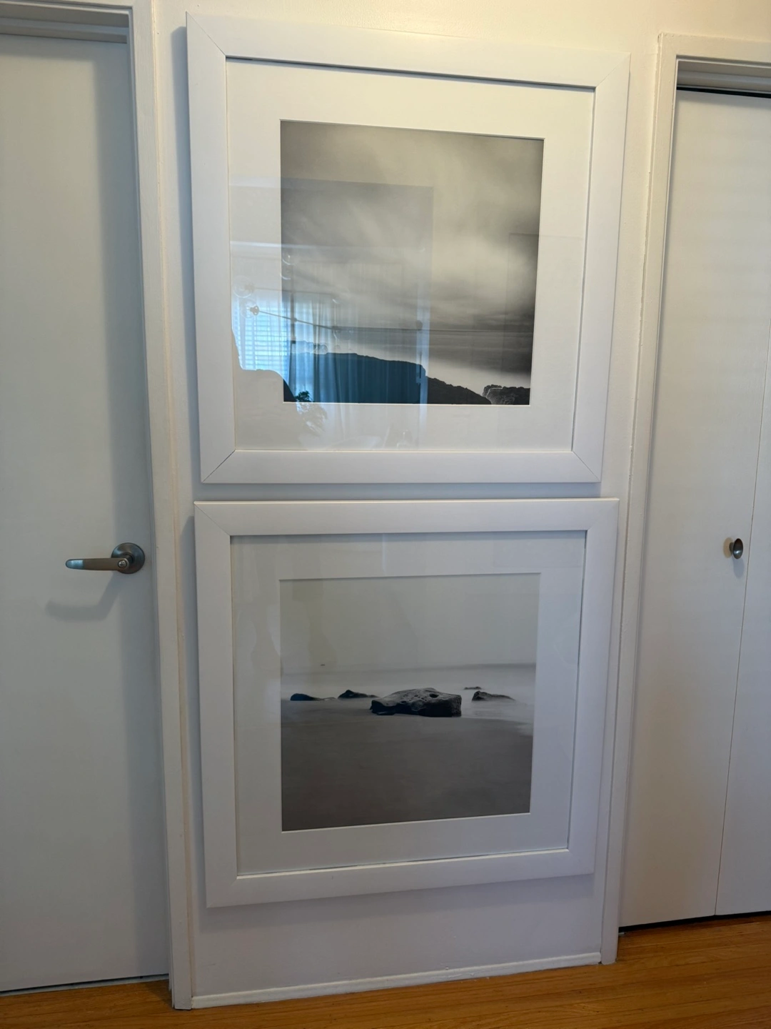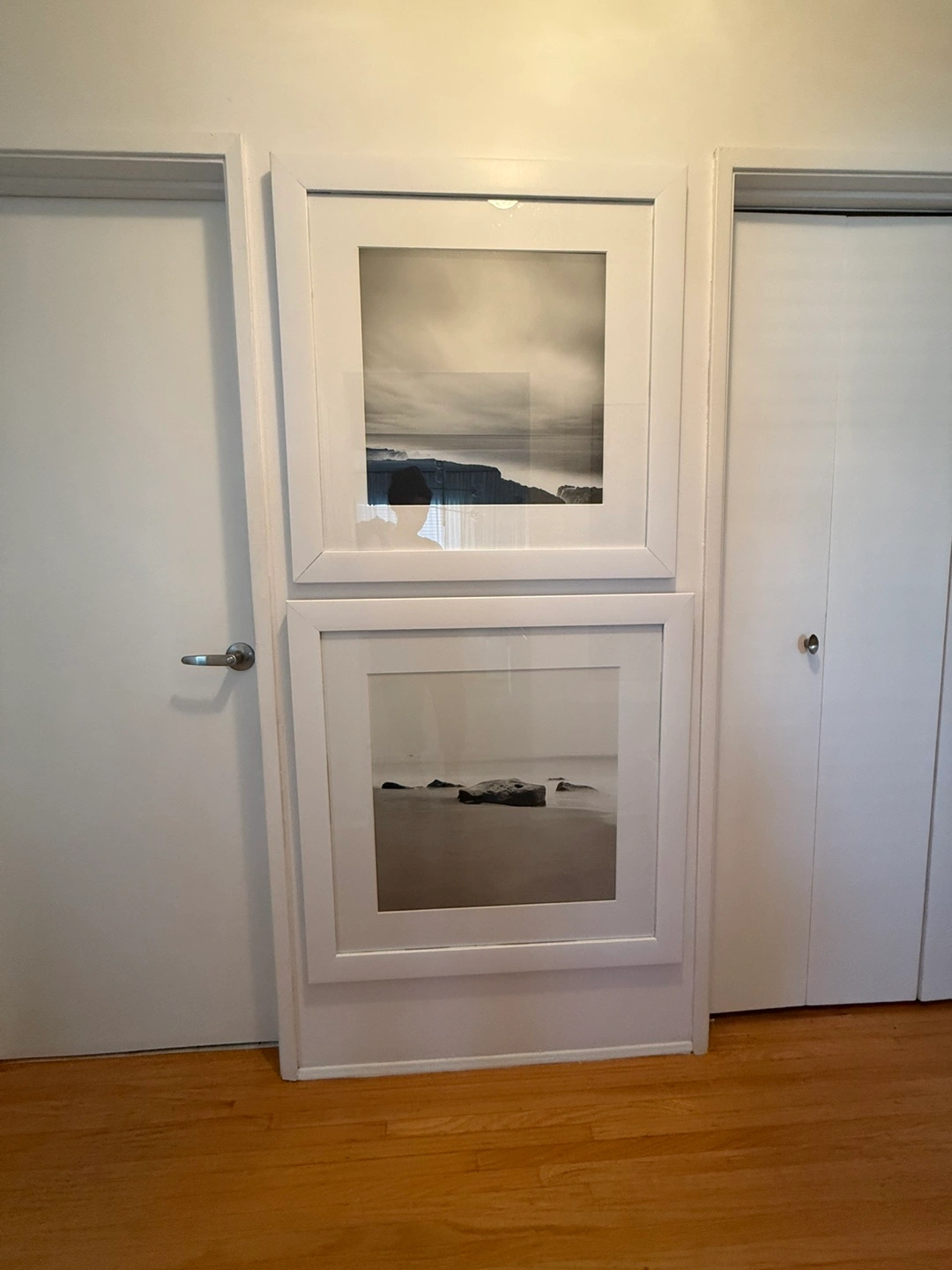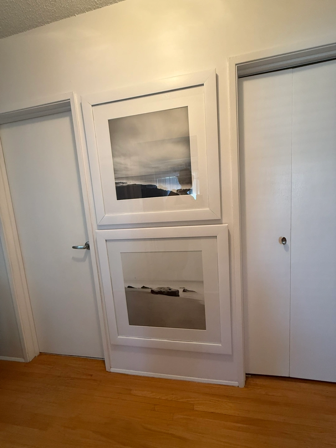 Large framed black and white landscape prints. Wood frame, tempered glass. 1 print measures 32.5” square 1 print measures 34.5” square $25 ea, or take both for $40