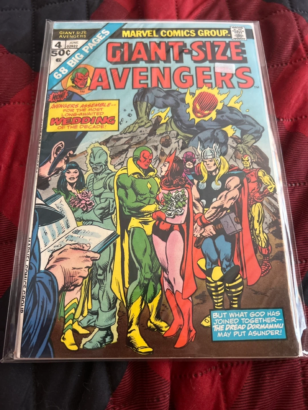 This is Giant-Size Avengers #4, published by Marvel Comics in June 1975. It's a giant-sized issue with 68 big pages. The story is titled "Avengers Assemble -- For The Most Long-Awaited Wedding Of The Decade!".