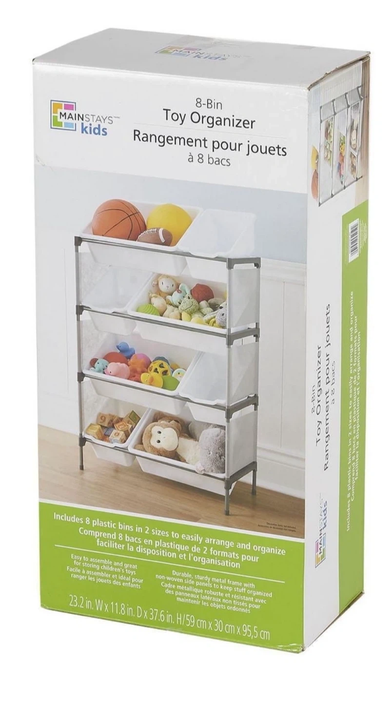 Declutter your little one's play area with this Mainstays Kids 8-Bin Toy Organizer! It features a durable, sturdy metal frame with non-woven material sides. It includes 8 plastic bins in 2 sizes, making it easy to arrange and organize toys. Dimensions are 23.2 inches wide x 11.8 inches deep x 37.6 inches high