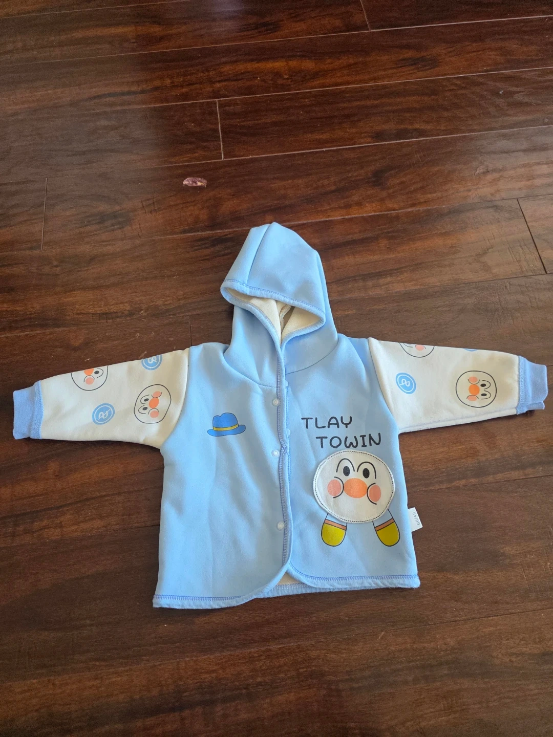 Cute blue hooded jacket and matching pants for your little one. Features a fun cartoon character and 'TLAY TOWIN' text. Made with soft, comfortable fabric. Perfect for everyday wear!