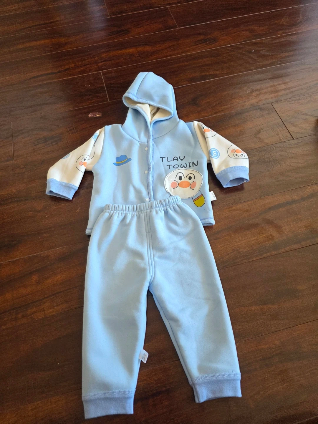 Cute blue hooded jacket and matching pants for your little one. Features a fun cartoon character and 'TLAY TOWIN' text. Made with soft, comfortable fabric. Perfect for everyday wear!