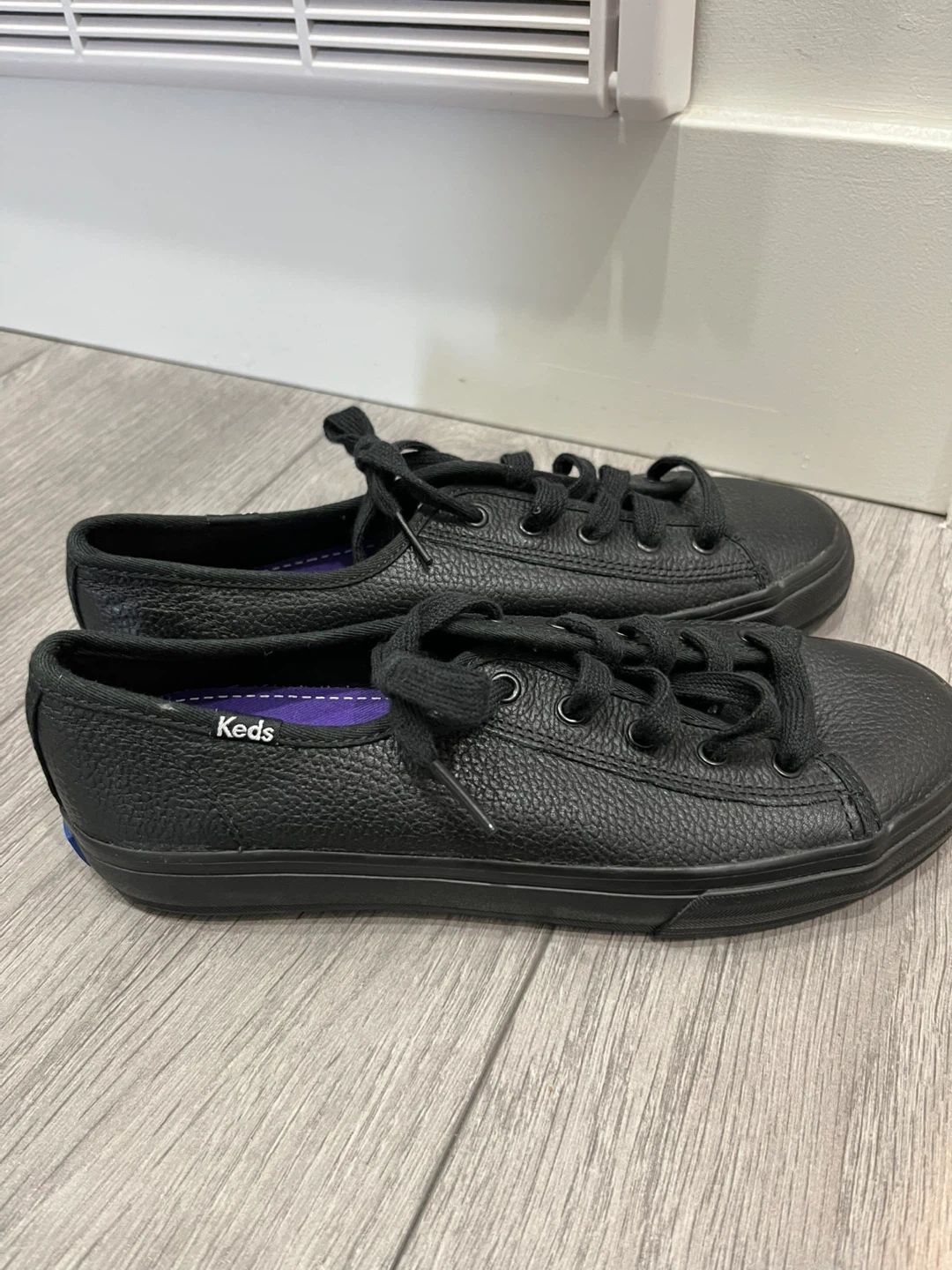 Keds women's sneakers in a black pebbled leather finish. These lace-up shoes have a classic silhouette with a durable rubber sole. Size 6.5. They're perfect for everyday wear!
