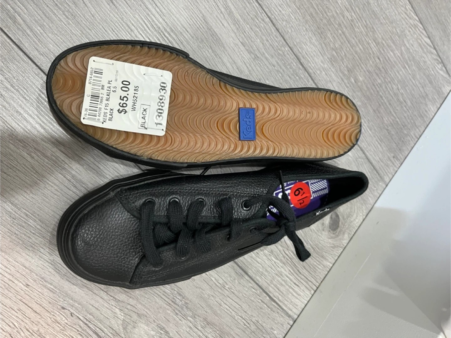 Keds women's sneakers in a black pebbled leather finish. These lace-up shoes have a classic silhouette with a durable rubber sole. Size 6.5. They're perfect for everyday wear!