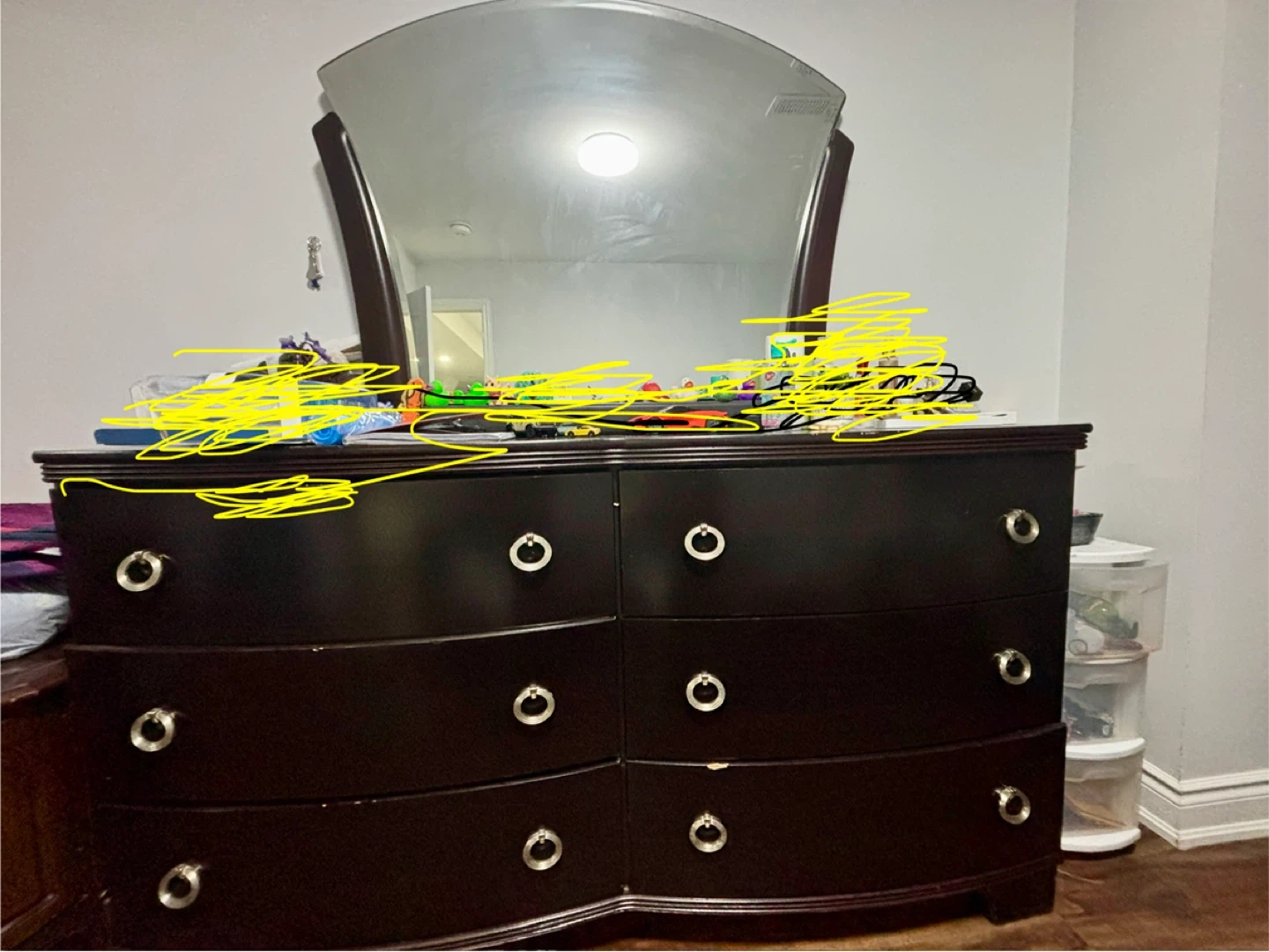 This is a dark brown dresser with a curved front and six drawers. It includes a large, arched mirror. The dresser has silver ring pulls on each drawer. It's made of wood. It's a good size for a bedroom.